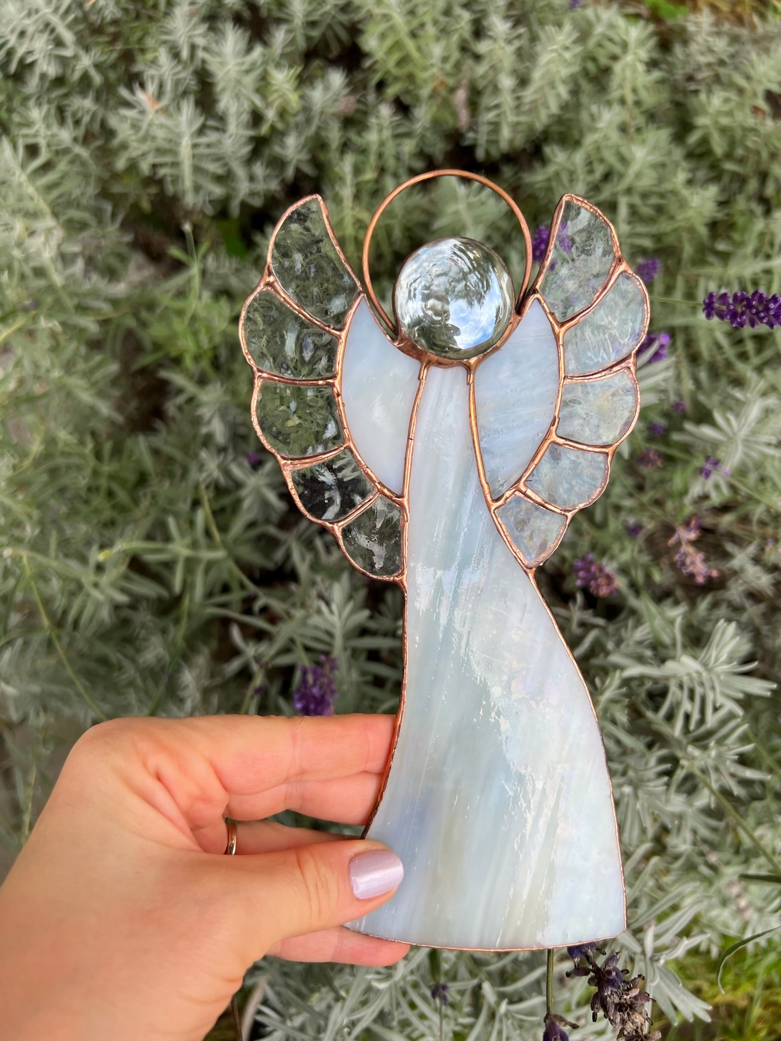 Anioł gracji został stworzony z 13 kawałków szkła witrażowego najwyższej jakości. Jego delikatny wzór i pastelowe odcienie tworzą subtelny i uroczy obraz, który emanuje spokojem. Każdy kawałek szkła został ręcznie dobierany, co nadaje aniołowi niepowtarzalny charakter.
