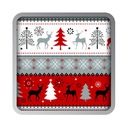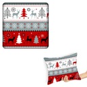 Poszewki świąteczne, wzór sweterek czerwony - tkanina została podzielona na poziome pasy w kolorze białym, szarym i czerwonym. Na nich znajduje się świąteczny wzór. Widoczne są renifery, gwiazdki, choinki i wiele różnych elementów dekoracyjnych, które związane są ze świętami. Wzór przypomina swoim wyglądem świąteczny sweterek.