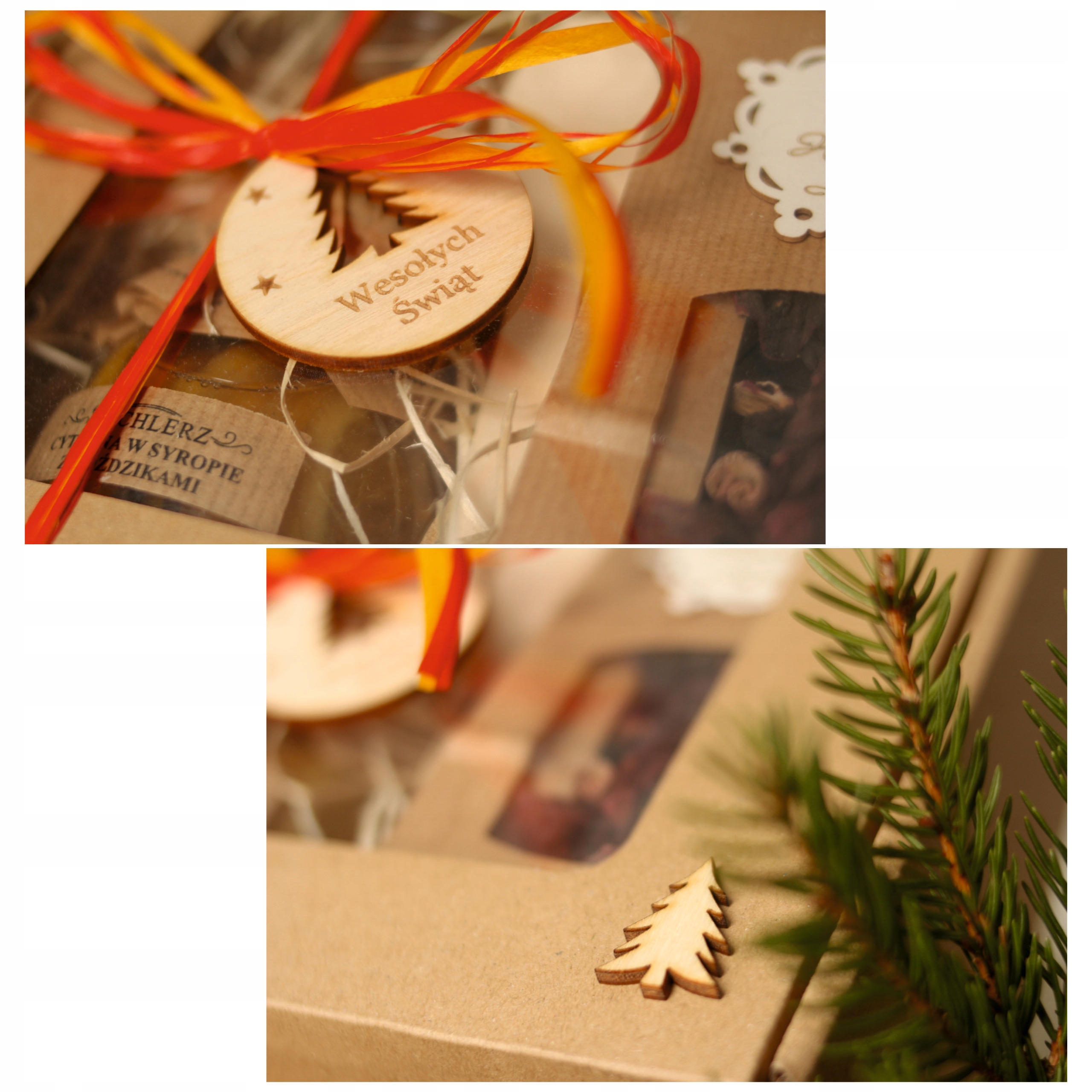 Kosz upominkowy przyozdobiliśmy drewnianymi dodatkami widocznymi na zdjęciu obok (bombką z napisem "Wesołych Świąt" oraz małą drewnianą choinką), które przykuwają uwagę i wprowadzają magię świąt.