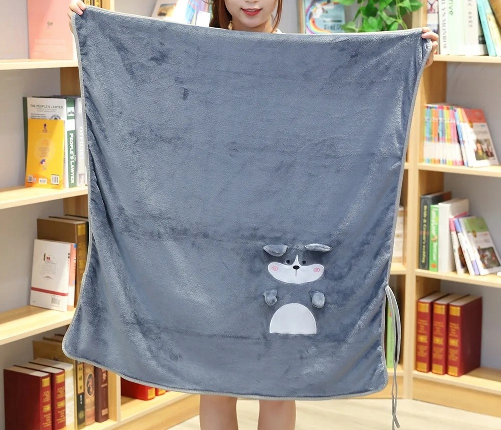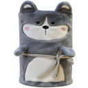 Kocyk może służyć nie tylko jako okrycie, ale również jako przytulanka - ma naszyte aplikacje, dzięki którym po złożeniu kocyk przybiera formę przytulanki w kształcie pieska.