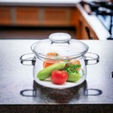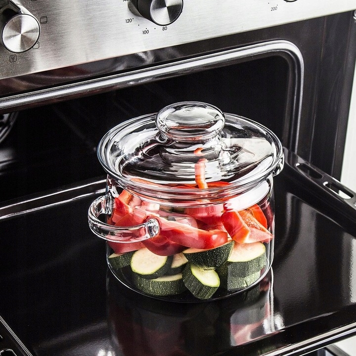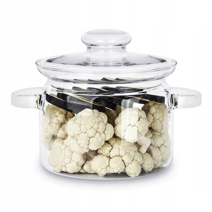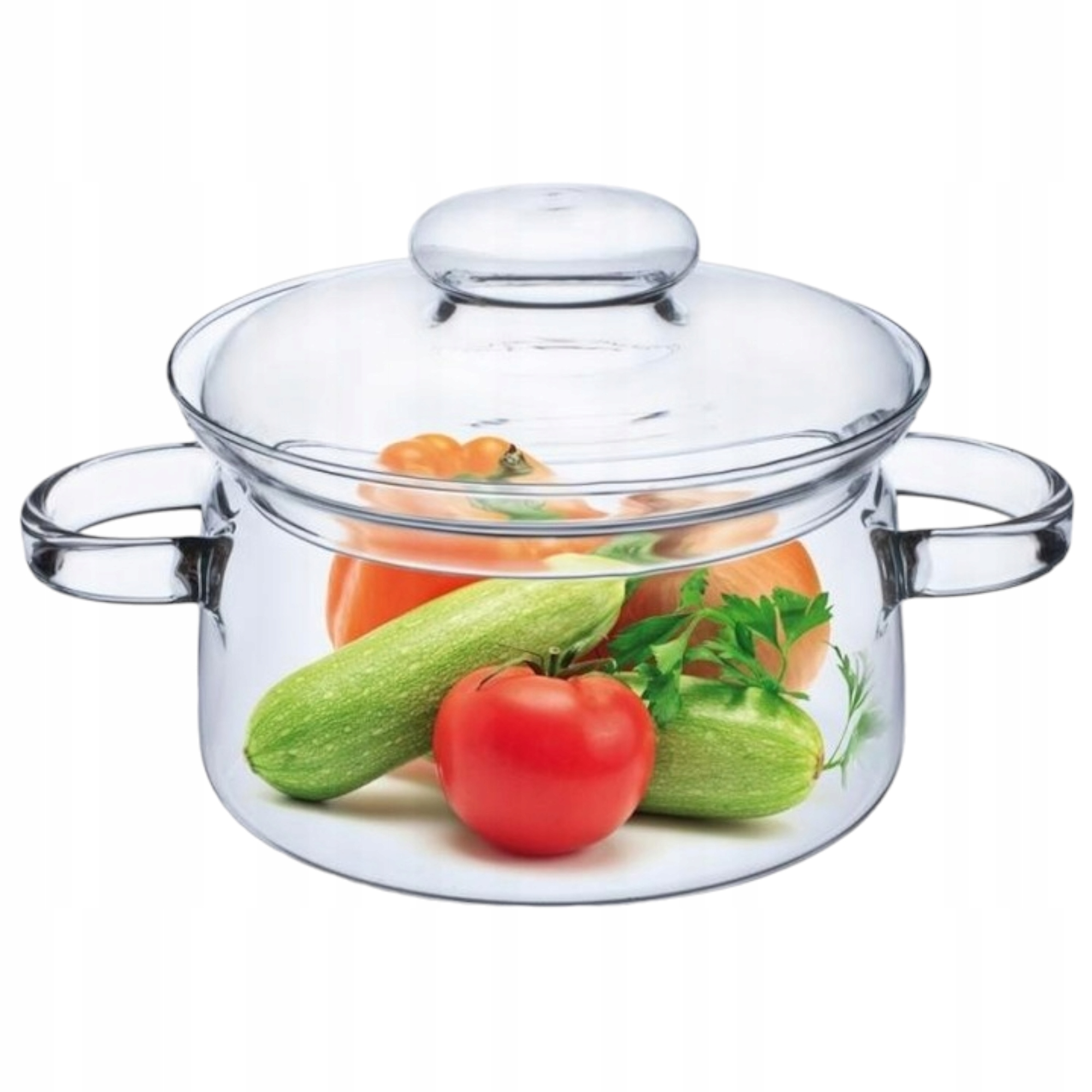 Szklany garnek ma pojemność 2 L, nadaje się do gotowania, przechowywania w lodówce, odgrzewania.