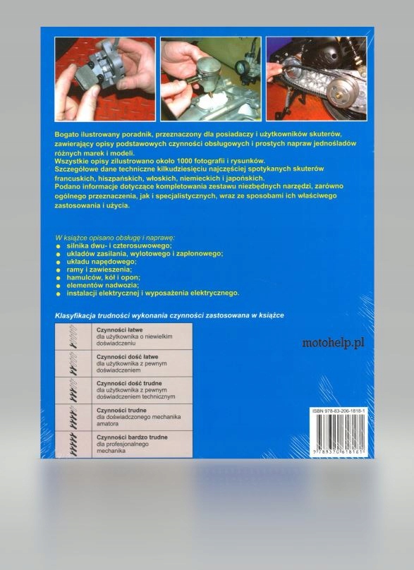 Praktyczny poradnik okraszony dużą ilością ilustracji poświęcony obsłudze i naprawie skuterów francuskich (Peugeot, MBK), hiszpańskich (Derbi), włoskich (Aprilia, Gilera, Malaguti, Piaggio, Vespa), niemieckich (Sachs) i japońskich (Honda, Suzuki, Yamaha) wyposażonych w silniki gaźnikowe o pojemności od 50 do 250 cm3 i automatyczne skrzynki przekładniowe. Opisano podstawowe narzędzia do obsługi i naprawy, zasady bezpieczeństwa i higieny pracy podczas obsługi technicznej, czynności wchodzące w zakres obsługi podstawowej i rozszerzonej oraz obsługę i naprawę poszczególnych zespołów i układów skuterów. Około 800 fotografii i rysunków przedstawiających przebieg poszczególnych czynności z zakresu obsługi i naprawy silnika, podwozia, nadwozia oraz urządzeń wyposażenia elektrycznego. Szczegółowe dane techniczne kilkudziesięciu skuterów różnych marek.