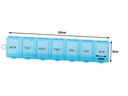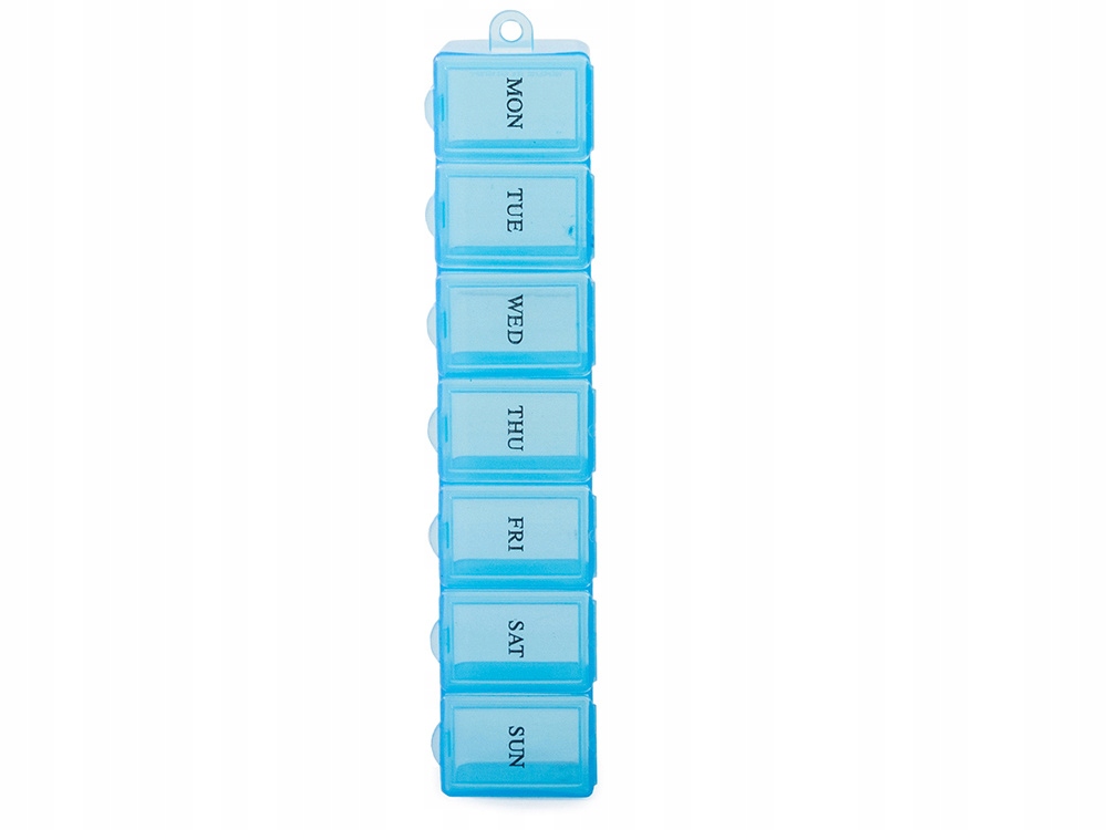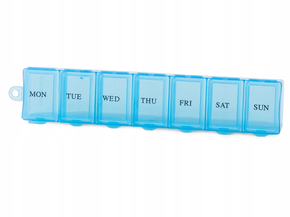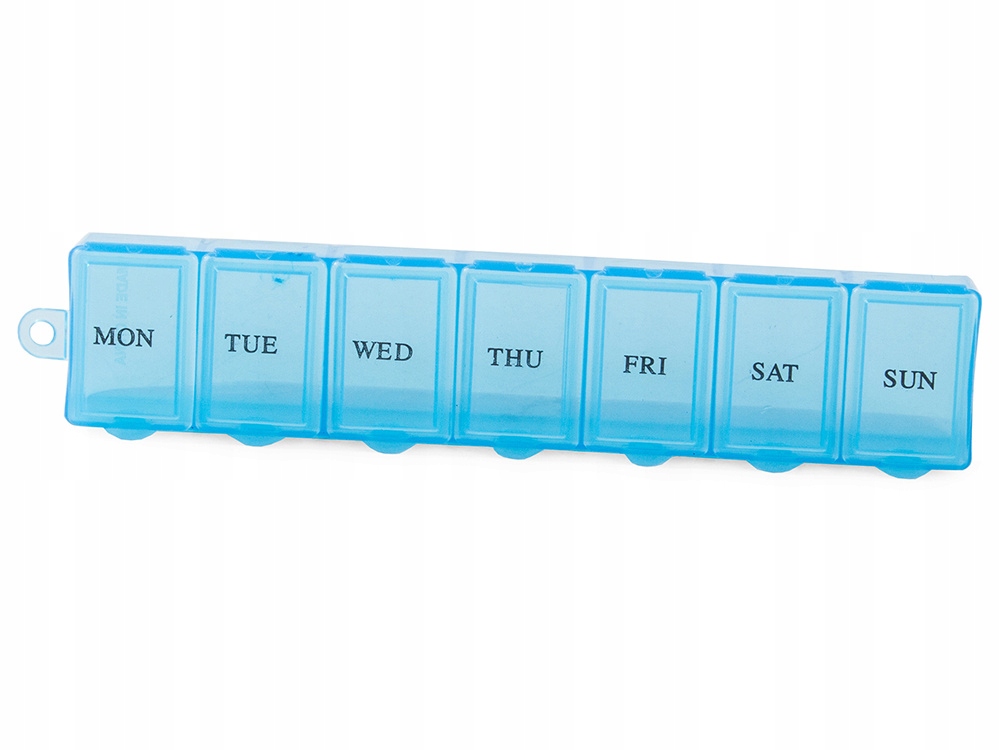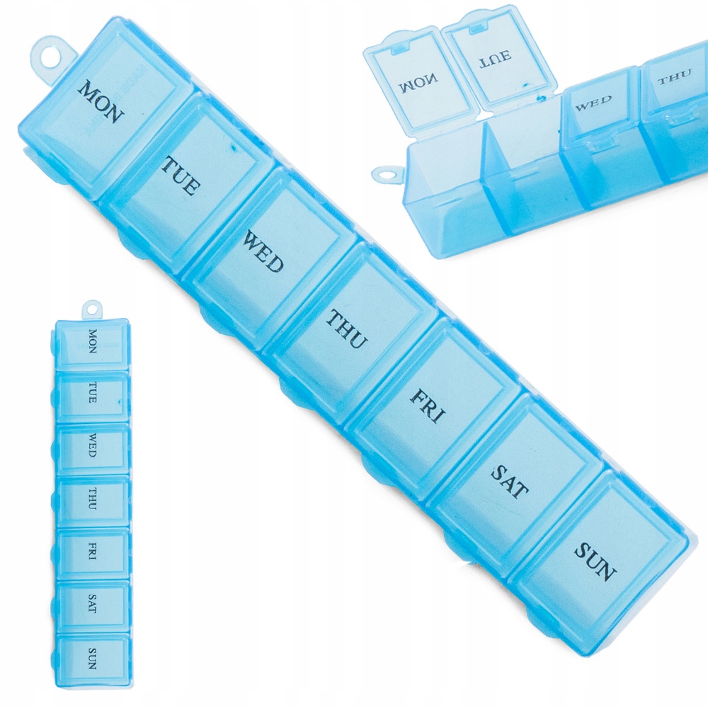 Każda z siedmiu przegród jest opisana dniem tygodnia w skrócie po angielsku, dzięki czemu bez trudu można odczytać, jaki lek należy przyjąć danego dnia. Pojemnik posiada również łańcuszek, który umożliwia zawieszenie go na haczyku lub przyczepienie do kluczyków.