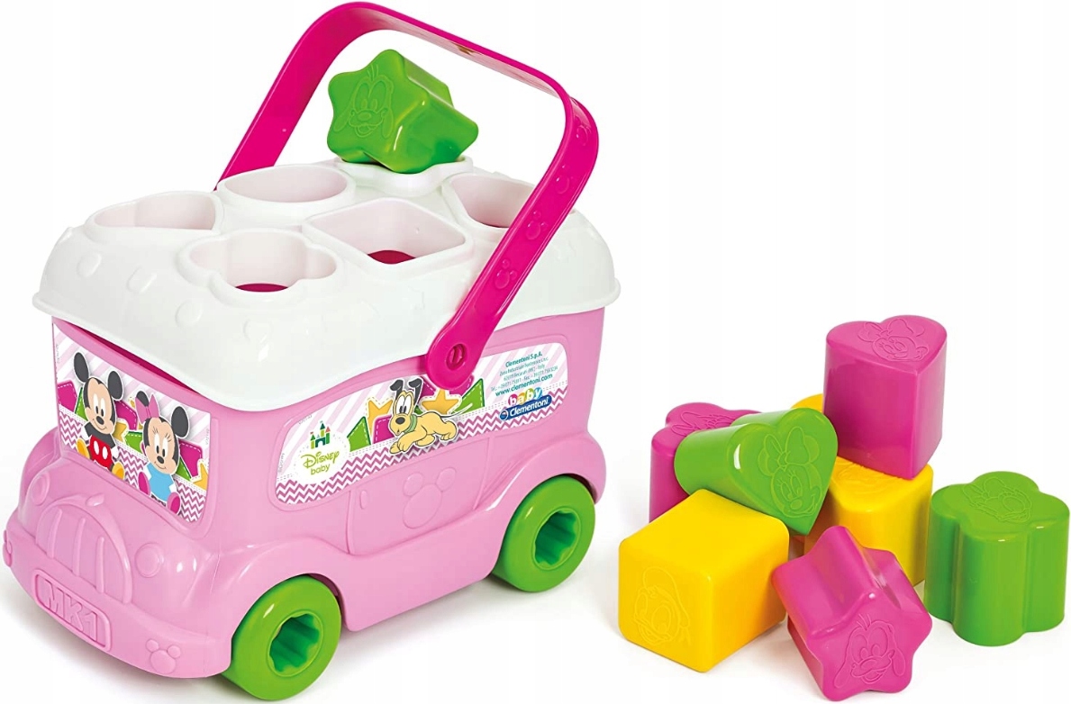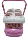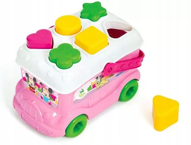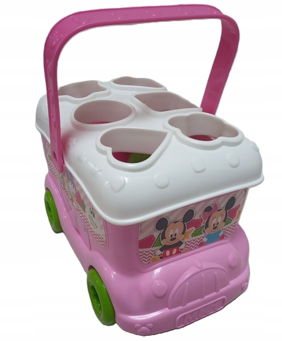 Pojazd ma ruchome koła i posiada obrazki z bohaterami bajek Disney'a: Myszką Minnie i Mickey.