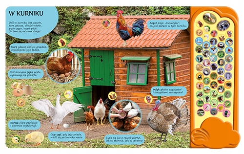 Книга берет маленьких читателей в незабываемое путешествие на ферму. Дети найдут в ней простые стишки об этом, что слышно в курятнике, в коровнике, в поле, в саду или у пруда. Отличительной чертой публикации является az 50 различных звуков. Благодаря ей малыш узнает, какие звуки издают гусь, воробей, корова, кузнечик или комбайн и трактор. Тщательно подобранные фотографии характеризуются яркой цветовой гаммой.