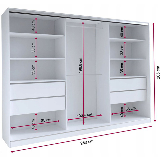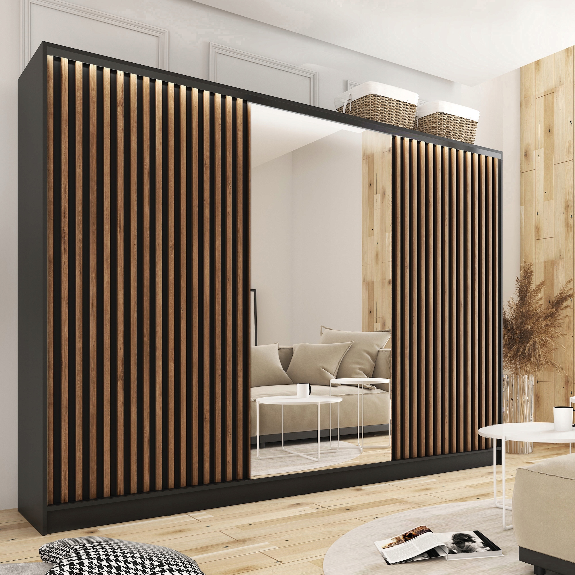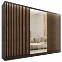 Szafa przesuwna z lustrem i lamelami LOFT 280 cm dzięki swojej stylistyce nadaje pomieszczeniu niesamowitego charakteru. Odpowiedzialne zagospodarowanie przestrzeni, oraz zastosowanie licznych półek wraz z szufladami i drążkami na wieszaki zapewni ci miejsce na twoje ubrania. Natomiast zastosowanie lameli u frontu, oraz korpusu w kolorze czarnego matu czyni szafę niezwykle uniwersalną aranżacyjnie. Dodatkowo szafa została wyposażona w pełnowymiarowe, przejrzyste lustro.