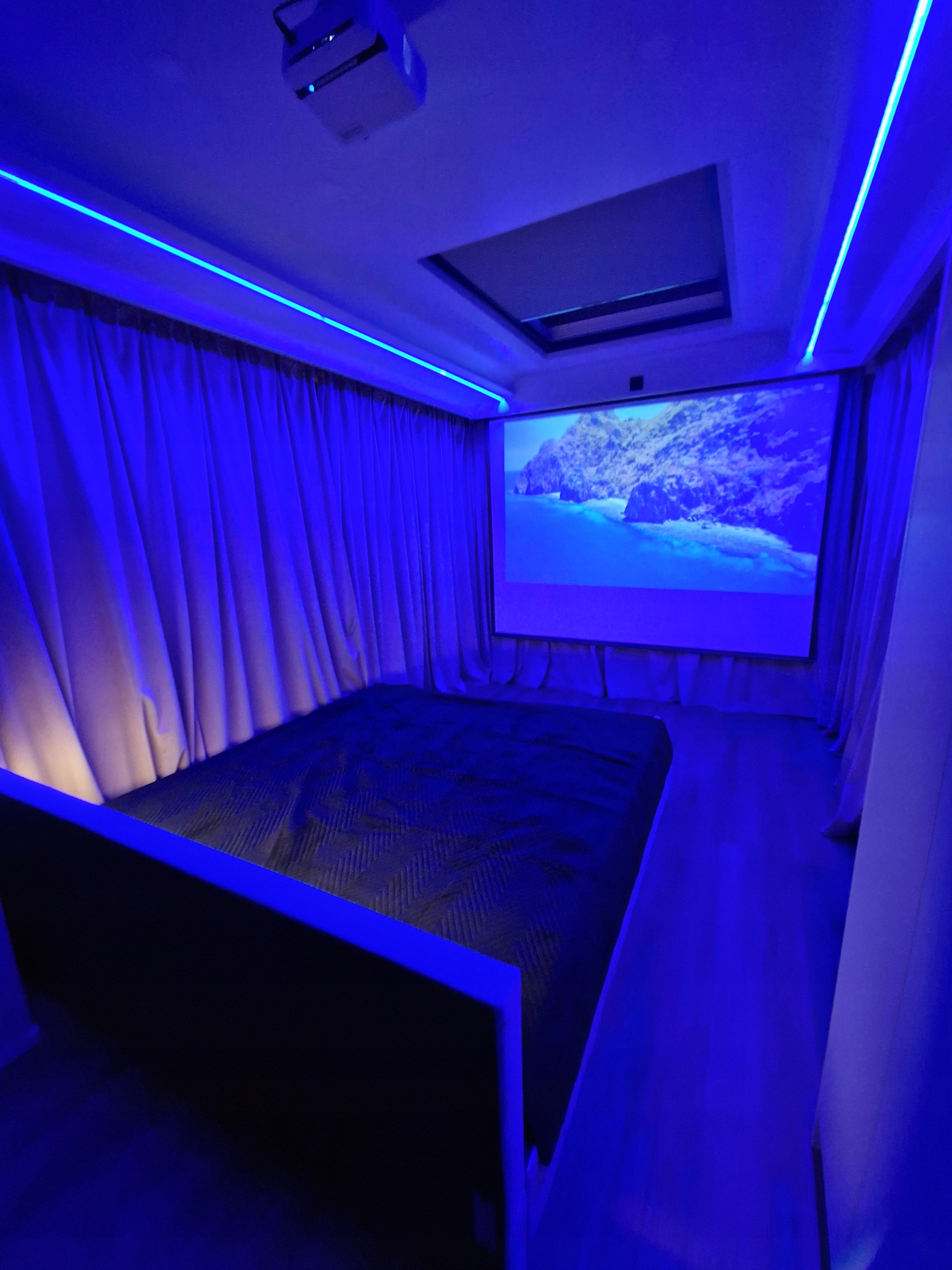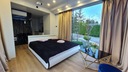 Największym pomieszczeniem jest sypialnia, połączona z aneksem kuchennym, skąd można przejść do łazienki z pomocą przesuwnych szklanych drzwi, lub na taras. Sypialnia wyposażona jest w duże podwójne łóżko, rzutnik oraz projektor, dzięki którym nie zabraknie czasu na nudę podczas chłodnych wieczorów. Ściany w salonie są przeszklone, dzięki czemu wypoczywając można swobodnie podziwiać piękno natury znajdującej się na zewnątrz, a gdy tylko zapragniesz odrobiny prywatności, możesz zasłonić okna zaciemniającymi zasłonami. Łazienka wyposażona jest w nowoczesny prysznic z deszczownicą, umywalkę wyposażona w podgrzewacz wody oraz toaletę. Wnętrze prezentuje się niezwykle okazale i nowocześnie. Taras jest w całości zadaszony, posiada efektowną szklaną barierkę, a także oświetlenie.