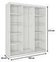Вместительный трехдверный раздвижной шкаф оснащен 8 полками из ламинированной плиты, на которые вы расставите блузки, футболки, толстовки или свитера, а также две палки для вешалок, которые они помогут вам позаботиться о безупречном виде рубашек, платьев или костюма. Цвет интерьера шкафа всегда он соответствует фронтам и не имеет возможности для изменений. Благодаря своей вместимости, шкаф будет работать в спальни, прихожей, гостиной или офиса.