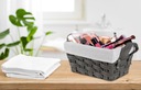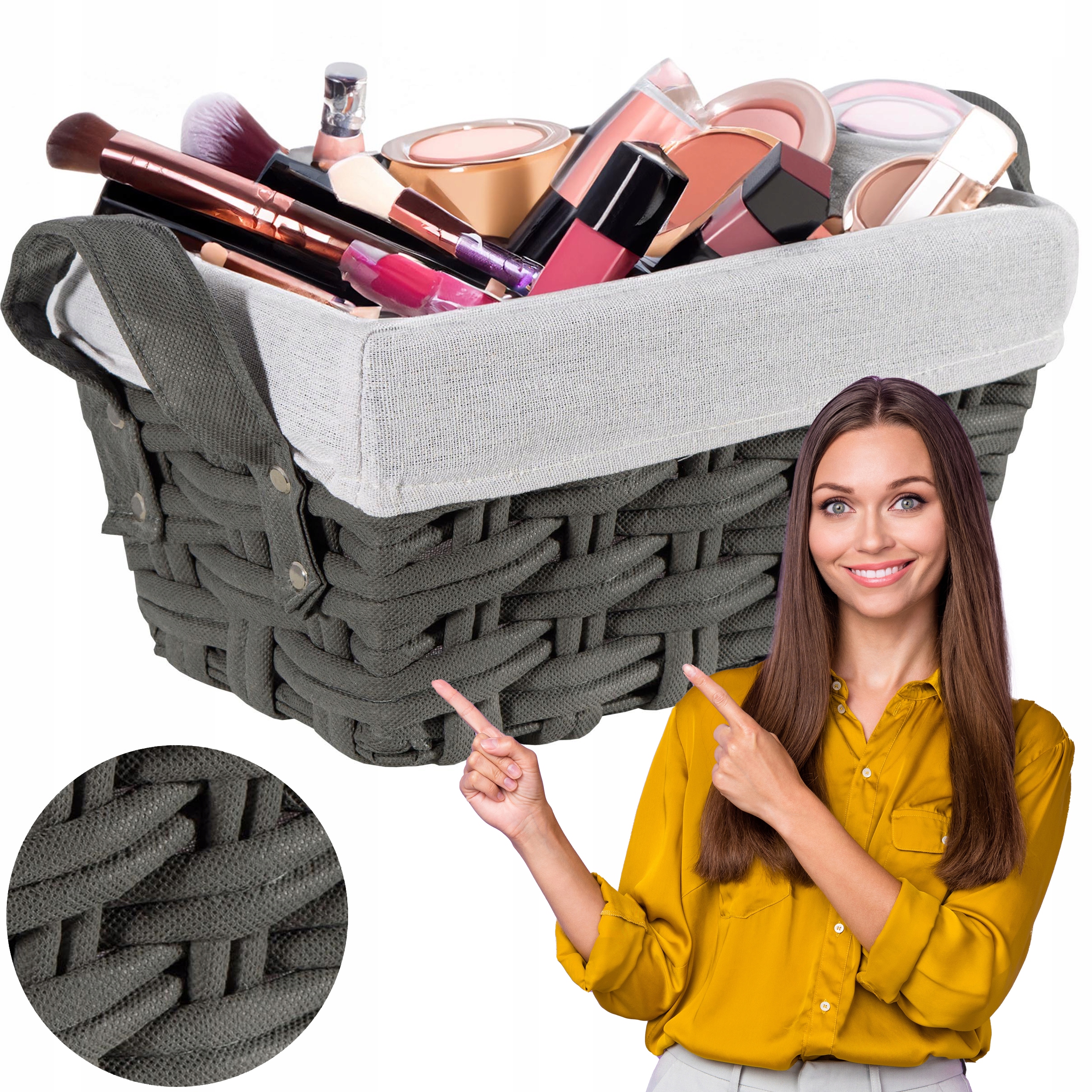 Koszyk Tiana grafitowy to doskonały wybór dla tych, którzy cenią sobie funkcjonalność i estetykę w jednym. Wykonany jest z najwyższej jakości włókniny poliestrowej wypełnionej pianką, solidnego metalowego stelaża oraz usztywnionej podstawy. Charakterystyczną cechą koszyka jest jego pleciona struktura, która nie tylko dodaje mu wytrzymałości, ale także sprawia, że posiada efektownie wyglądający wzór, wnosząc dodatkowy element dekoracyjny do każdego wnętrza. Estetycznie wykonany z dbałością o najdrobniejsze detale łączy w sobie elegancję i praktyczność. Jest lekki, ma wbudowane wygodne rączki do przenoszenia i posiada kompaktowe wymiary, co czyni go idealnym rozwiązaniem do przechowywania różnego rodzaju drobiazgów, od kosmetyków po biurowe czy łazienkowe akcesoria. Koszyk Tiana jest wyposażony w praktyczny, wyciągany wkład materiałowy, który ułatwia utrzymanie porządku i czystości. Idealnie wpisuje się w każdą przestrzeń, oferując zarówno funkcjonalność, jak i stylowe wykończenie. Doskonale pasuje do każdego wnętrza, od łazienki, przez sypialnię, po salon i kuchnię. Jego subtelny, grafitowy kolor oraz estetyczne wykonanie sprawiają, że jest nie tylko praktycznym, ale i eleganckim dodatkiem do każdego domu.