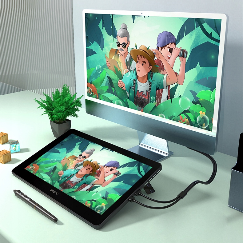 Tablet graficzny BOSTO BT-12HD to tablet z ekranem LCD. To urządzenie wskazujące (tak jak myszka czy klawiatura) przeznaczone do tworzenia grafik cyfrowych. Przydaje się także podczas nauki, robienia notatek, prowadzenia prezentacji czy wykładów. Jak sama nazwa wskazuje tablet posiada wyświetlacz. Efekty pracy są widoczne pod ręką na ekranie tabletu oraz komputera. Tablet do pracy potrzebuje ciągłego podłączenia do komputera.