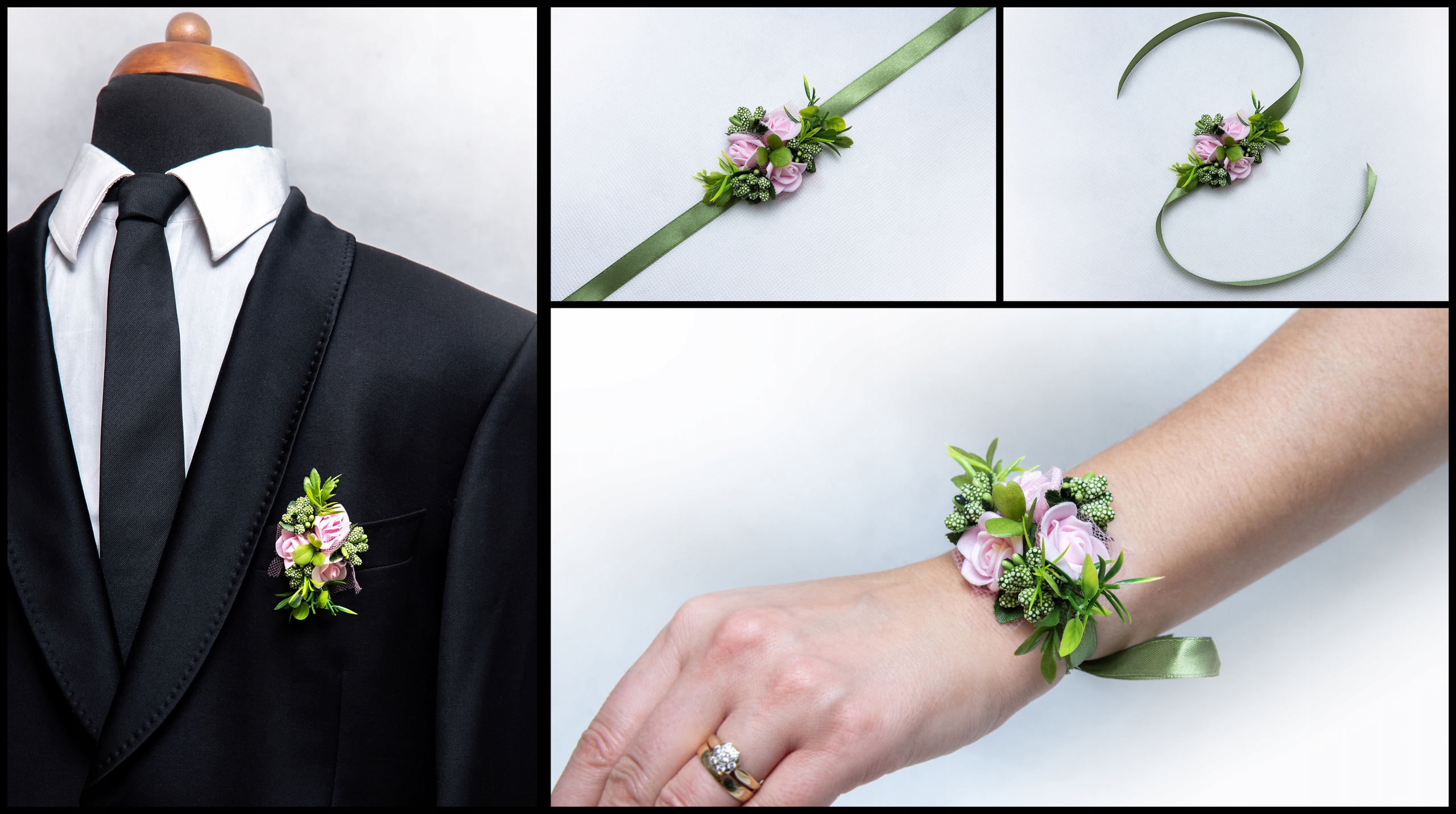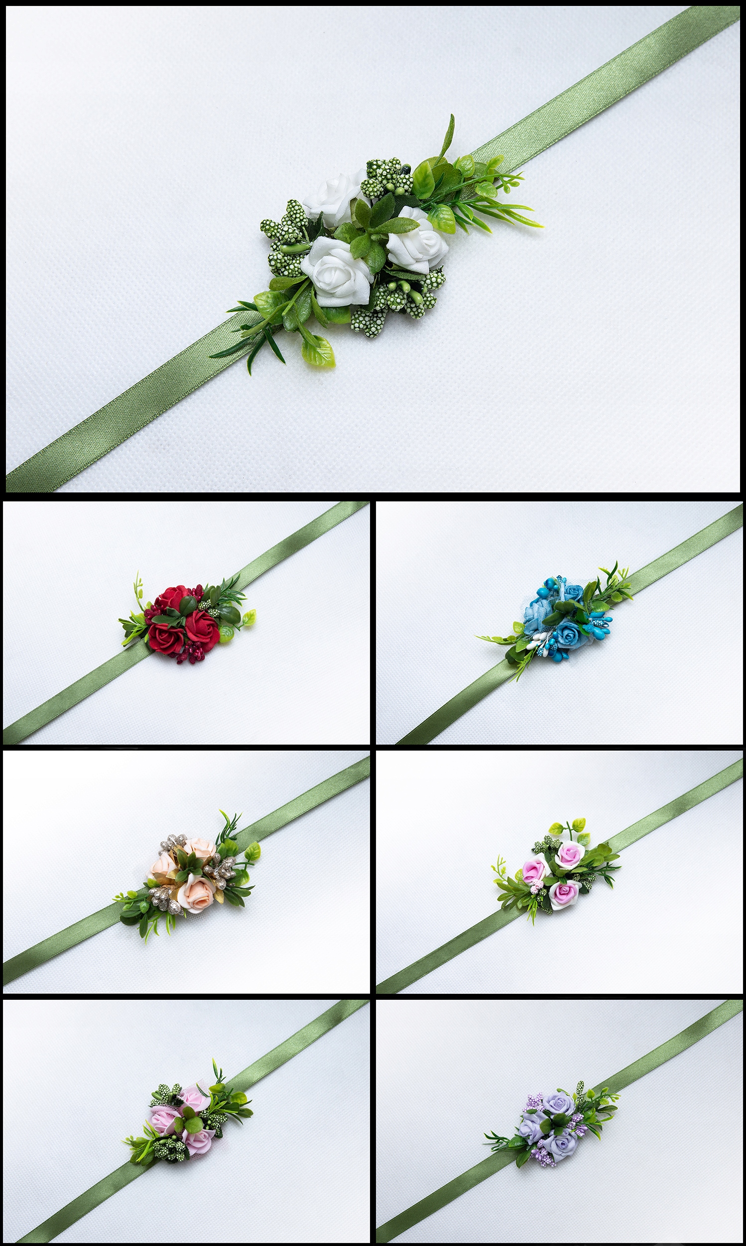 Букеты, сделанные на атласной ленте для завязки на руке. Булавки крепятся на цветочки и эффектные флористические аксессуары гарантируют оригинальный вид на свадьбе или выпускной.