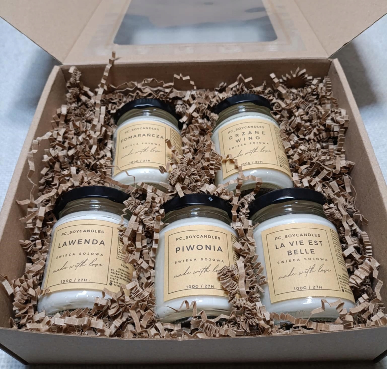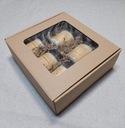 Świeczki spakowane w dekoracyjne pudełko z okienkiem oraz otulone ekologicznym papierem dekoracyjnym.