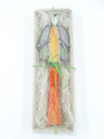 Aniołek zapakowany został w ręcznie wykonane pudełko o strukturze lnianej tkaniny z przezroczystym wieczkiem. Pudełko wypełnione jest delikatnym włóknem sizalowym w kolorze lnu. Wymiary opakowania: 8,5cm x 25,5cm x 2,5cm.