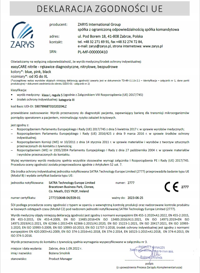 zgodność z normami technicznymi: EN 455-1:2020, EN 455-2:2015, EN 455-3:2015, EN 455-4:2009, EN ISO 13485:2016+EN ISO 13485:2016/A11:2021, EN ISO 14971:2019+EN ISO 14971:2019/A11:2021, EN 62366-1:2015+EN 62366-1:2015/A1:2020, EN ISO 15223-1:2021, EN ISO 20417:2021, EN ISO 10993-1:2020, EN ISO 10993-5:2009, EN ISO 10993-10:2013, EN ISO 11737-1:2018, EN 420:2003+A1:2009, EN ISO 374-1:2016+A1:2018, EN 374-2:2014, EN 16523-1:2015+A1:2018, EN 374-4:2013, EN ISO 374-5:2016, ASTM D6978, ASTM F1671, ASTM D6319