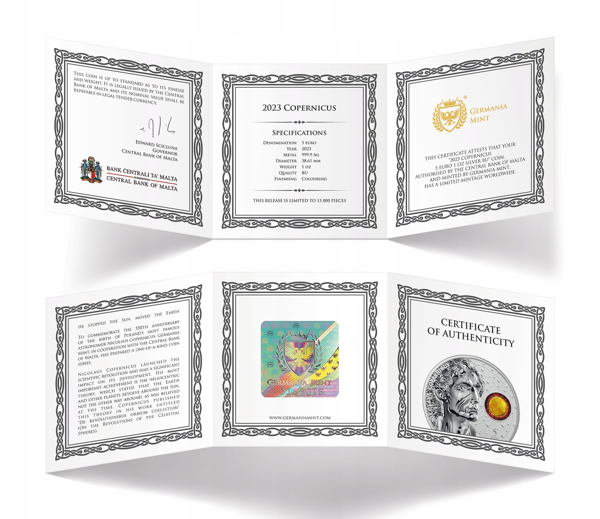 Z okazji 550. rocznicy urodzin wybitnego polskiego astronoma Mikołaja Kopernika, firma Germania Mint w kooperacji z Bankiem Centralnym Malty wydała w 2023 roku wyjątkową monetę z czystego srebra o nominale 5 euro.