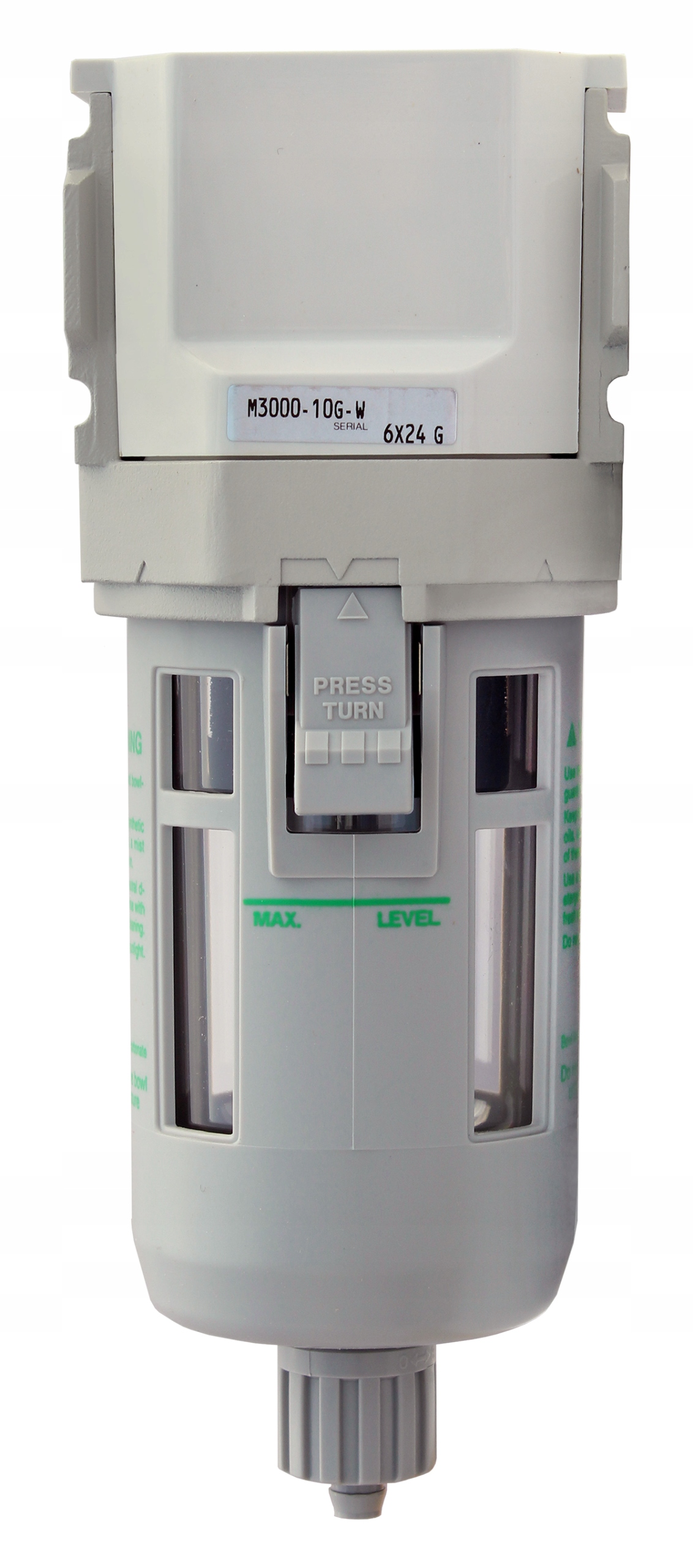 Filtr powietrza z reduktorem, odwadniacz CKD W3000 - 10G to wysokiej klasy filtr modułowy przeznaczony do usuwania z sprężonego powietrza cząstek stałych i ciekłych. Wkład filtrujący o gradacji 5 mikronów. Filtr wyposażony w ręczny spust kondensatu z przyłączem na wąż Fi 6 mm. Przyłącze powietrza z strony wejścia i wyjście gwint wewnętrzny 3/8".