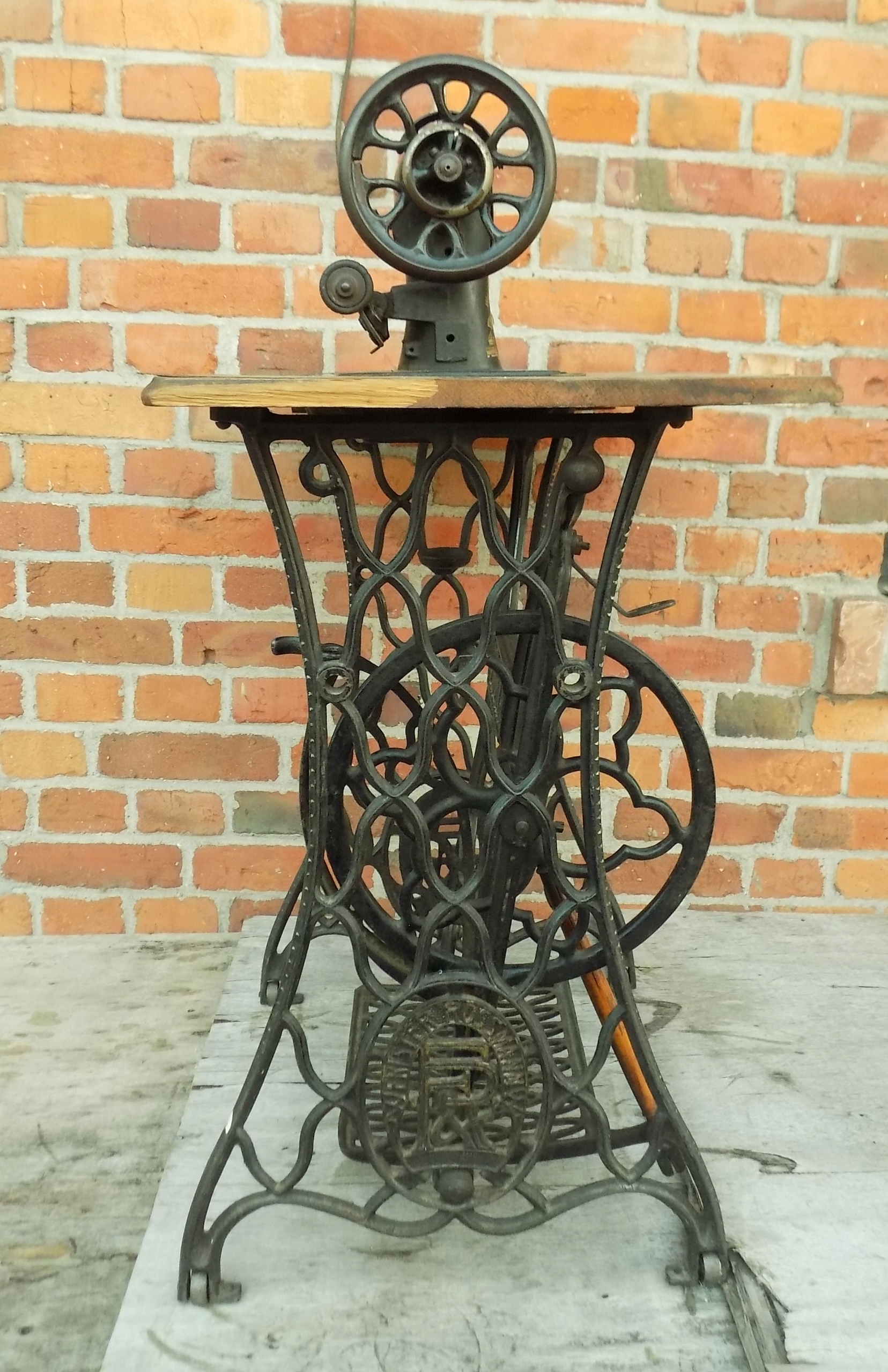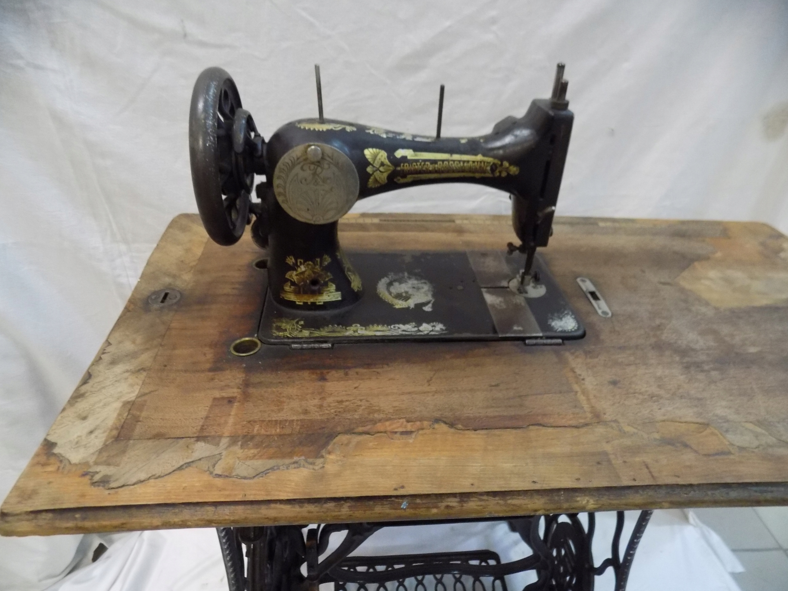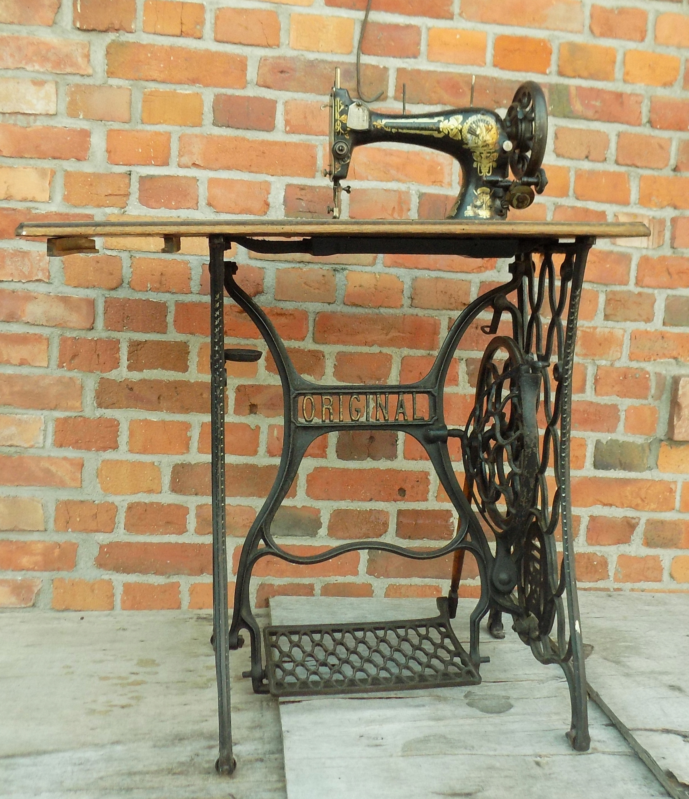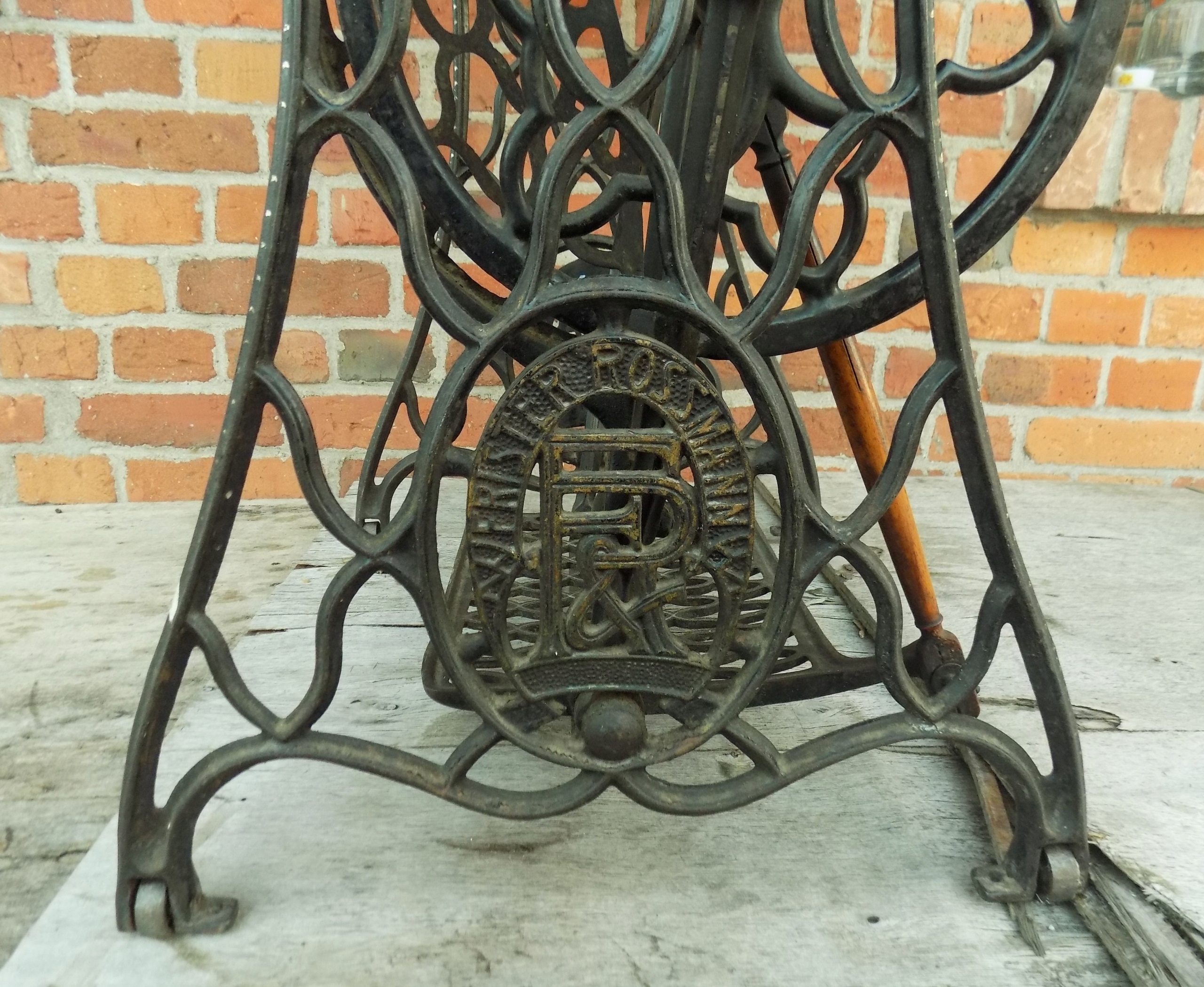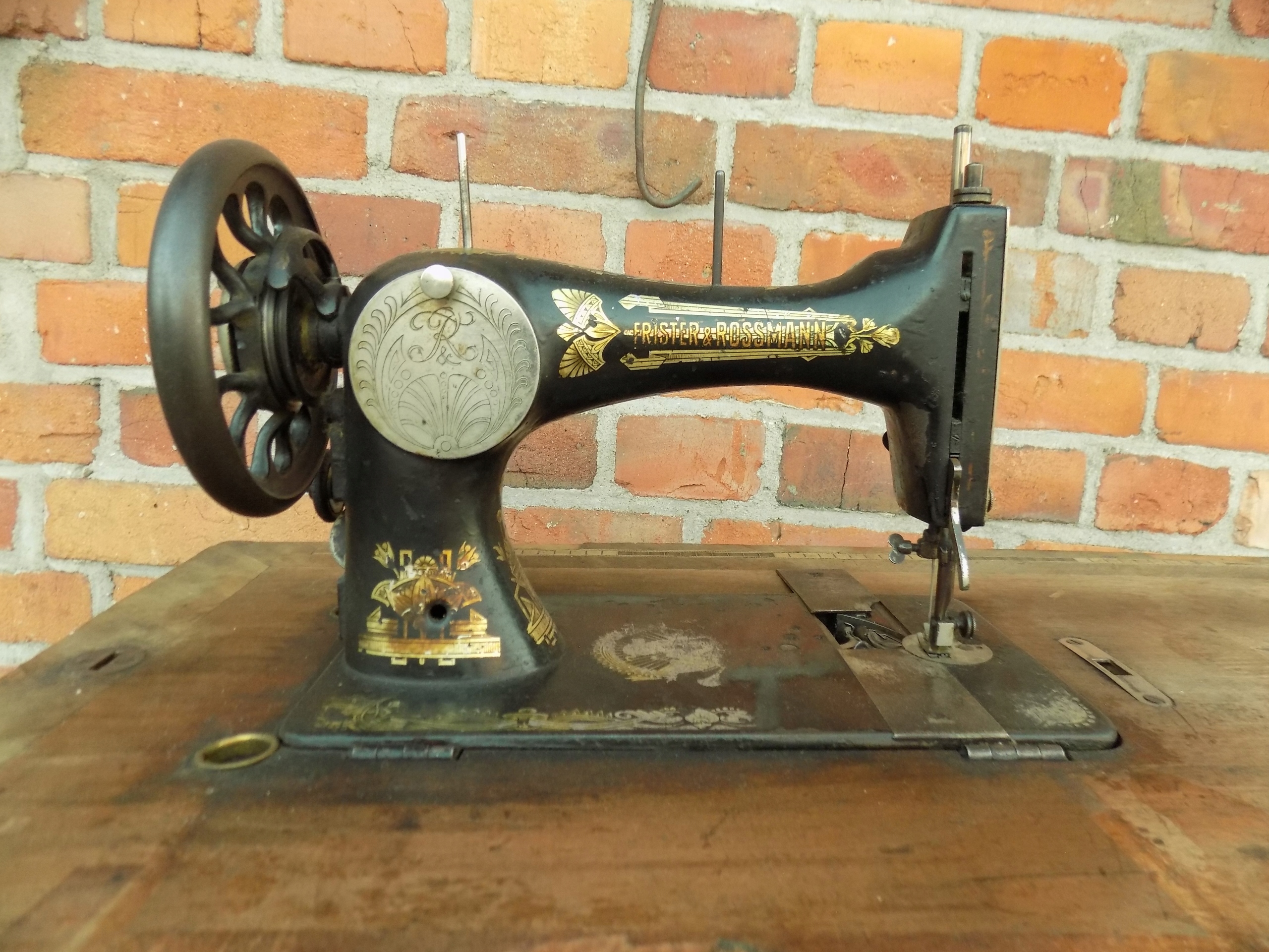 Zabytkowa maszyna do szycia Original marki Frister & Rossmann na podbudowie żeliwnej. Wymiary; wys. 97(75) x 85 x 46 cm. Przedmiot w stanie pokazanym na zdjęciach.