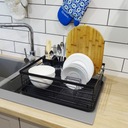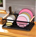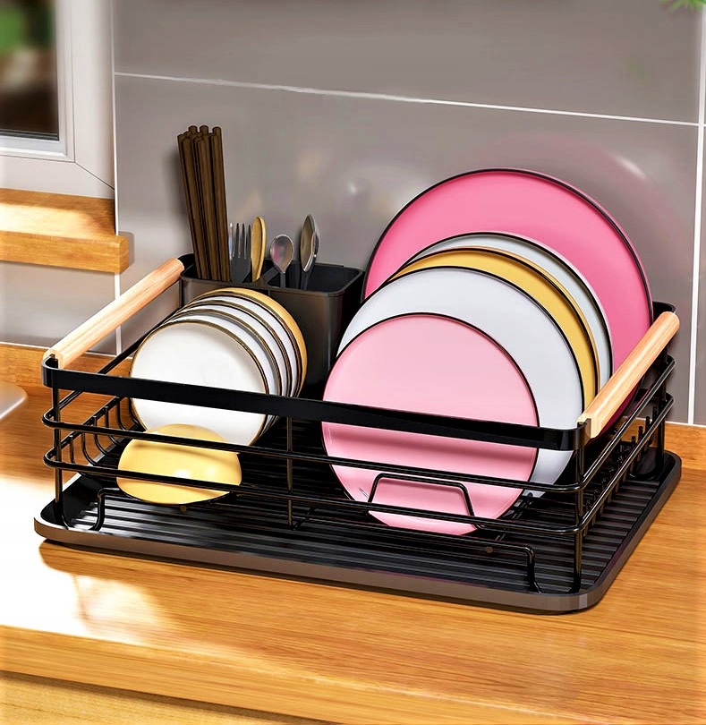 Metalowa, czarna rama oraz drewniane wstawki idealnie wpasują się we wnętrze każdej kuchni. Uchwyty mają zaokrąglone i gładkie krawędzie, dzięki czemu są poręczne w użyciu. Cała metalowa konstrukcja pomalowana jest proszkowo na jednolity kolor - czarny. Całość doskonale prezentuje się w kuchni, a także doskonale spełnia swoją funkcję. Naczynia szybko wysychają na ociekaczu, a dzięki podkładce do przechowywania wody ociekacz można umieścić praktycznie wszędzie.