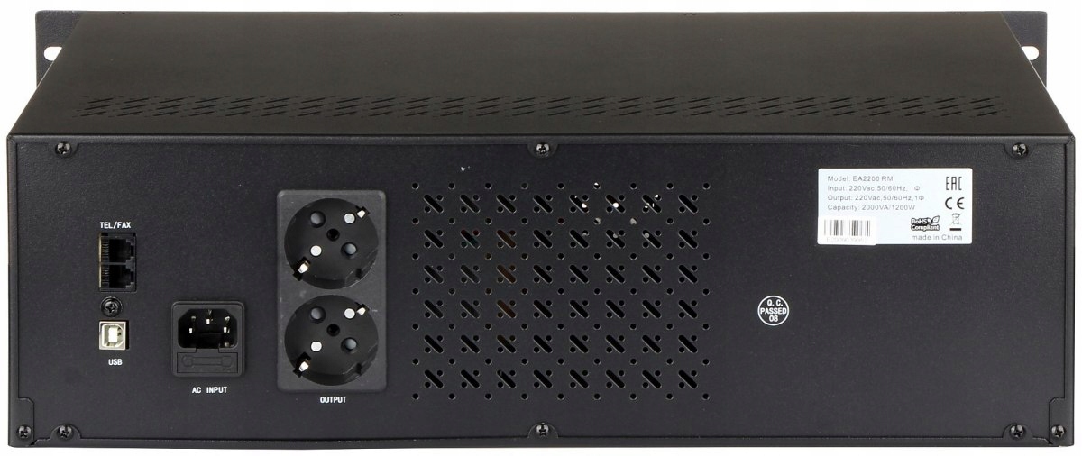 Moc czynna: 1200 W ; Moc pozorna: 2000 VA ; Akumulator: 2 szt. ; Szacunkowy czas pracy na akumulatorze: 62 minuty @ 100 W, 31 minut @ 200 W, 16 minut @ 300 W, 9.5 minuty @ 500 W ; Liczba wyjść: 2 szt. ; Sygnalizacja stanu pracy: Wyświetlacz LCD: poziom napięcia we/wy, częstotliwość wejścia, pojemność akumulatora, obciążenie, alarm, Sygnalizacja dźwiękowa ;