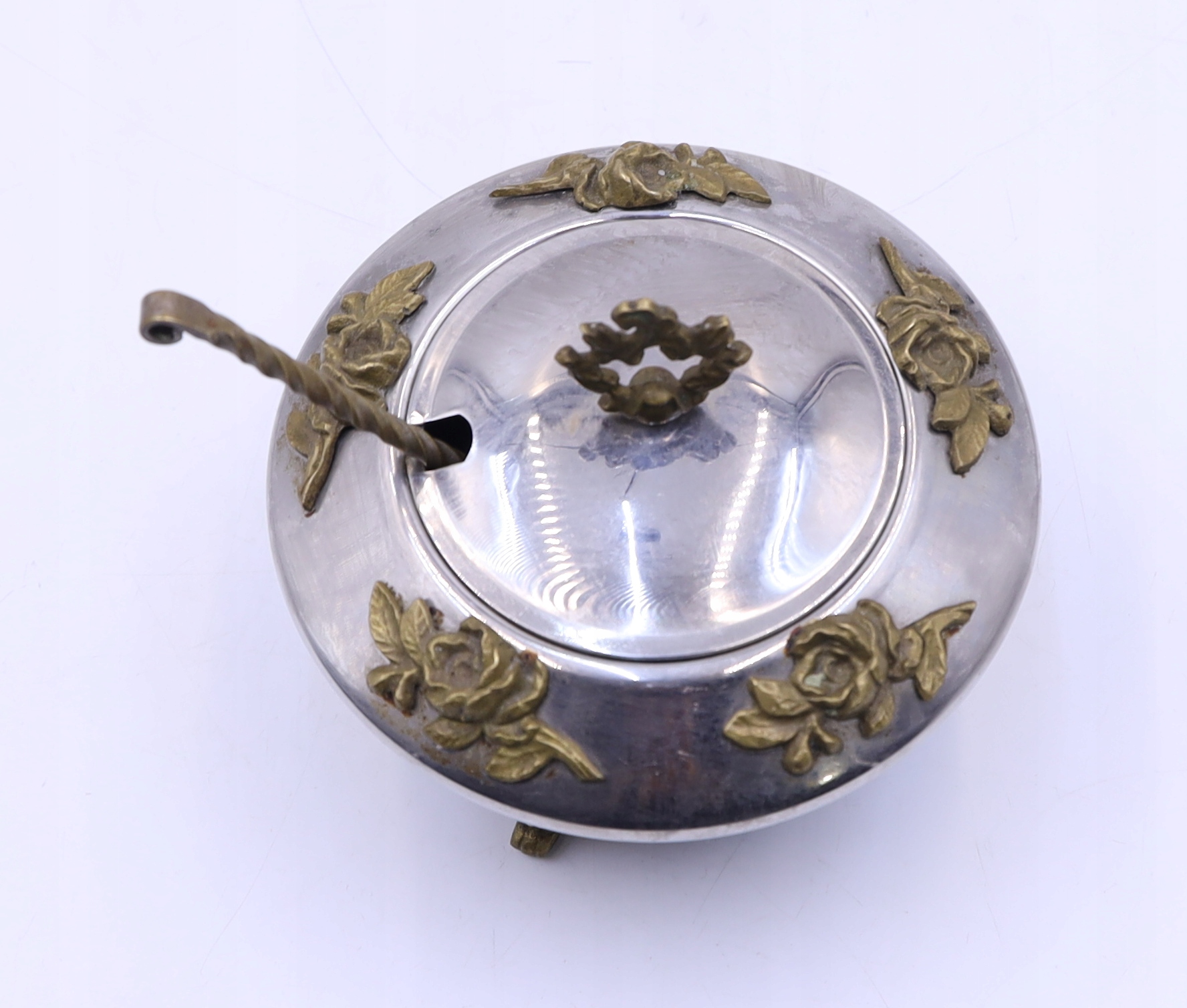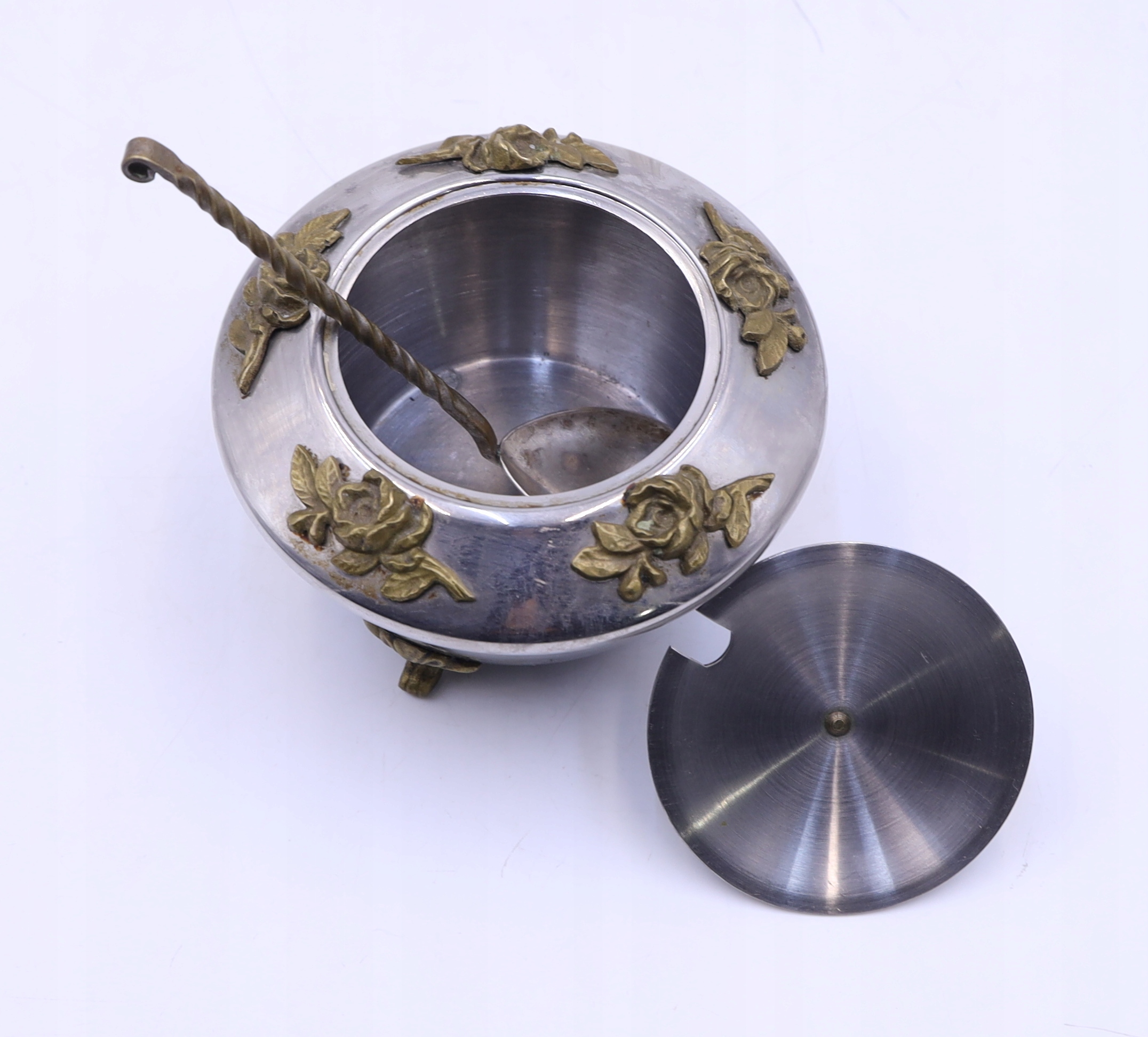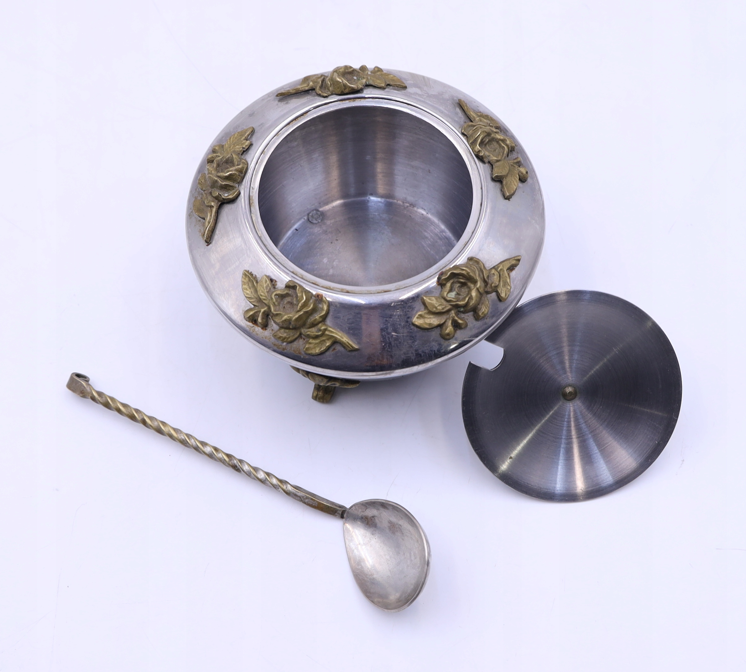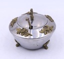 Metalowa cukiernica platerowana z łyżeczką prawdopodobnie z okresu PRL. Zdobiona elementami z mosiądzu. Ślady użytkowania. Łyżeczka sygnowana. Wymiary: wys.10 x 11,5 cm. Polecam