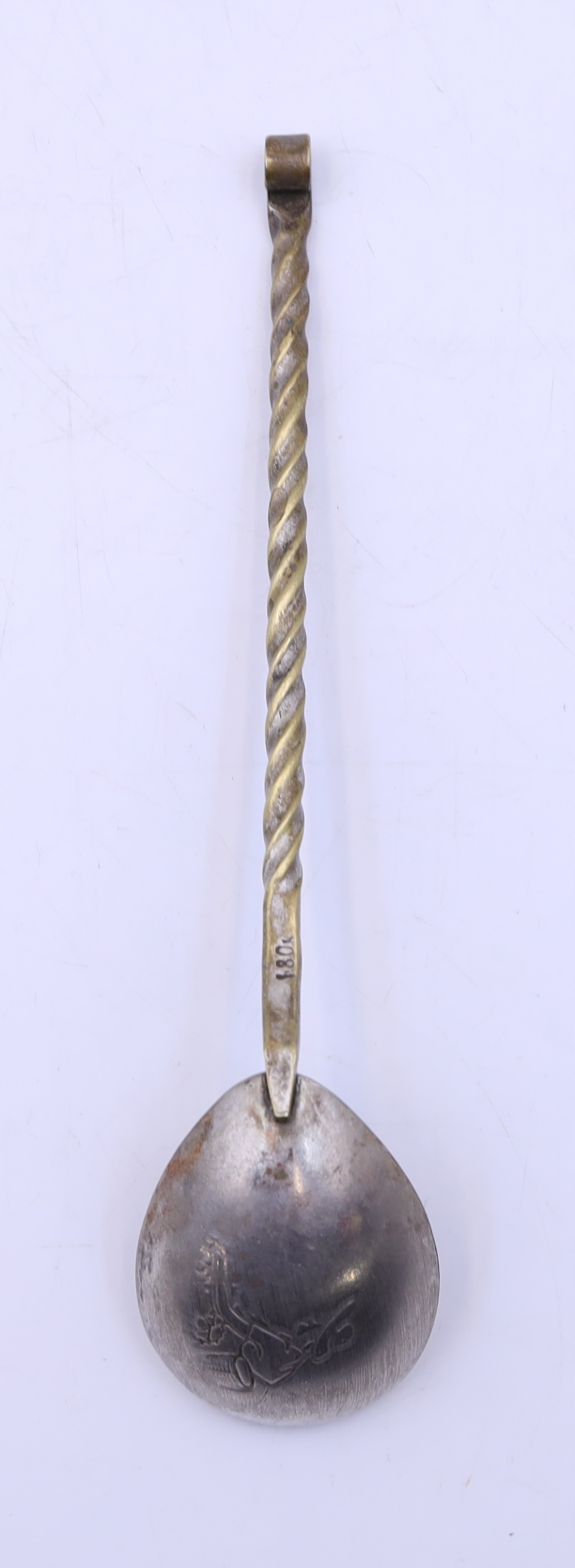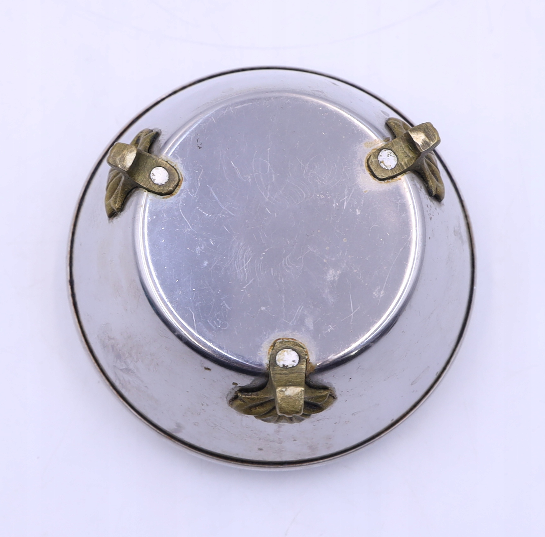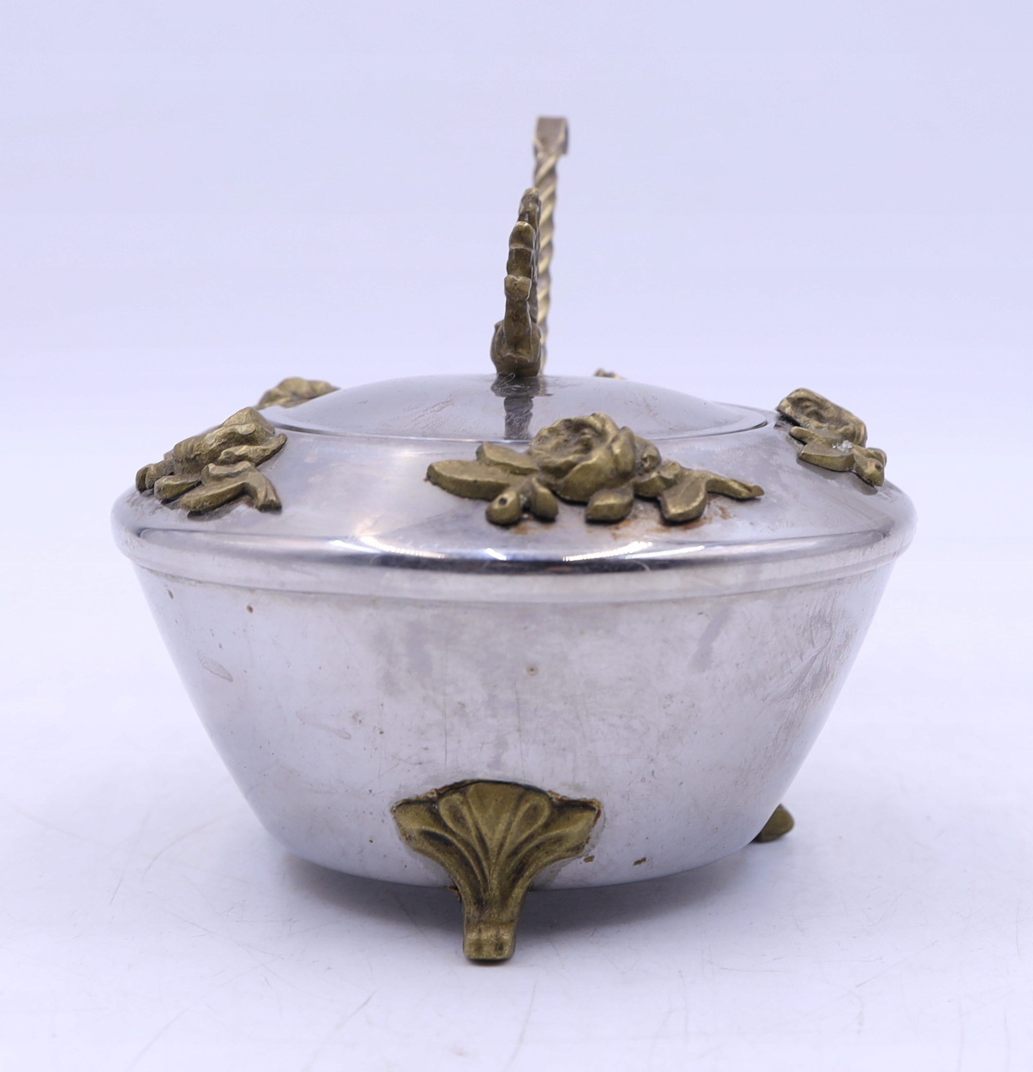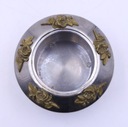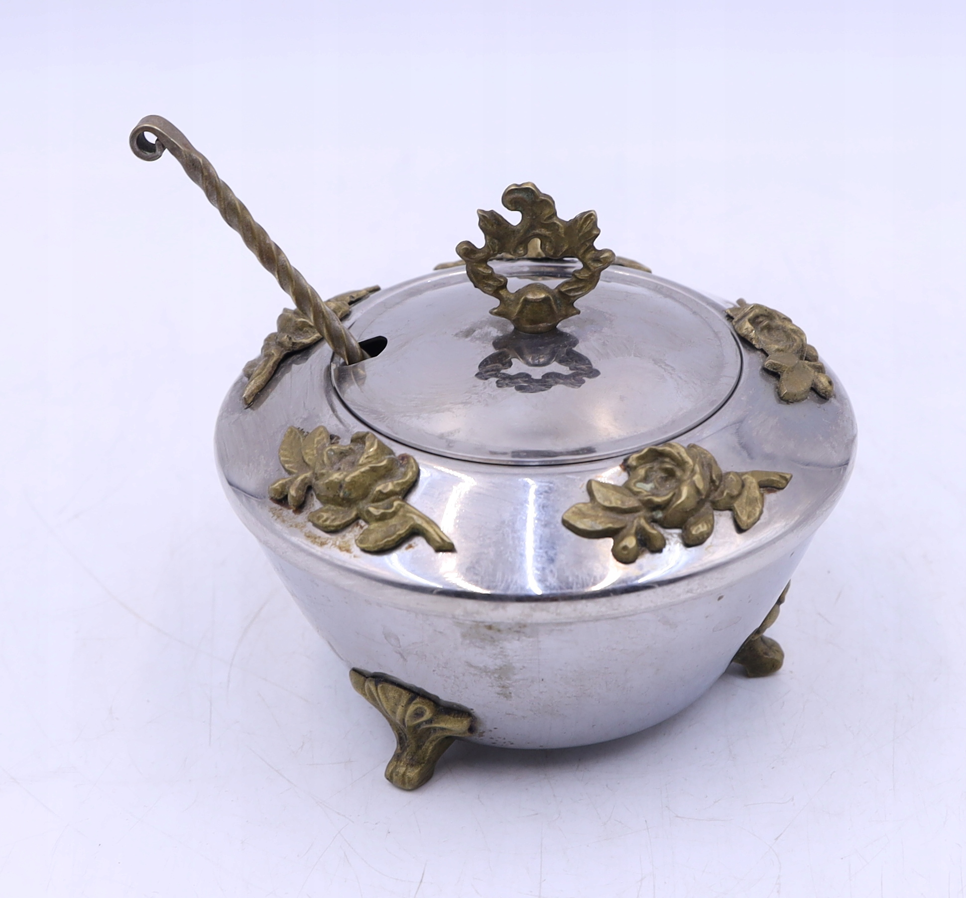 Metalowa cukiernica platerowana z łyżeczką prawdopodobnie z okresu PRL. Zdobiona elementami z mosiądzu. Ślady użytkowania. Łyżeczka sygnowana. Wymiary: wys.10 x 11,5 cm. Polecam
