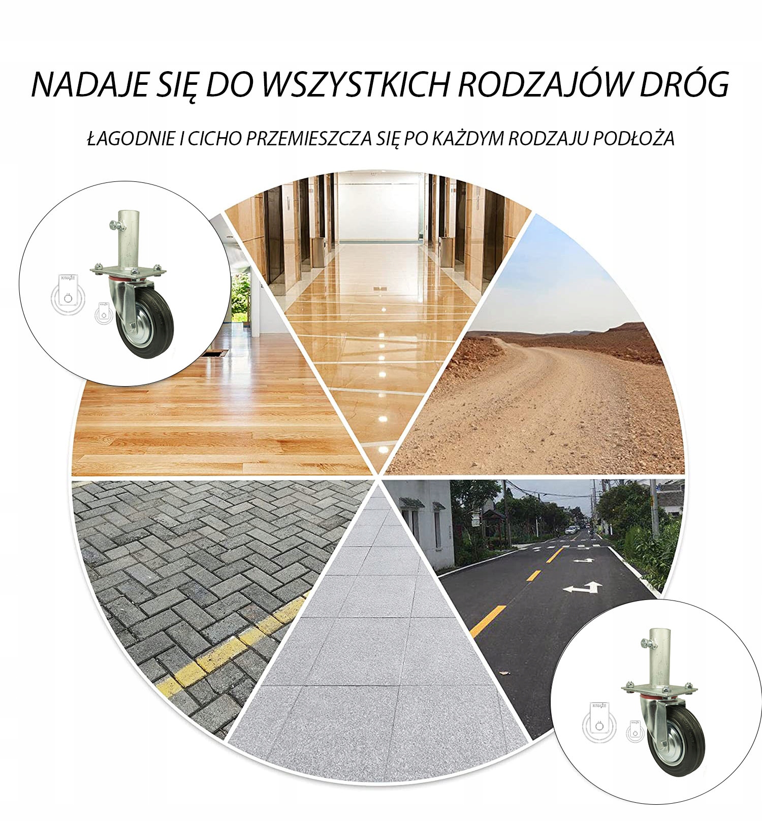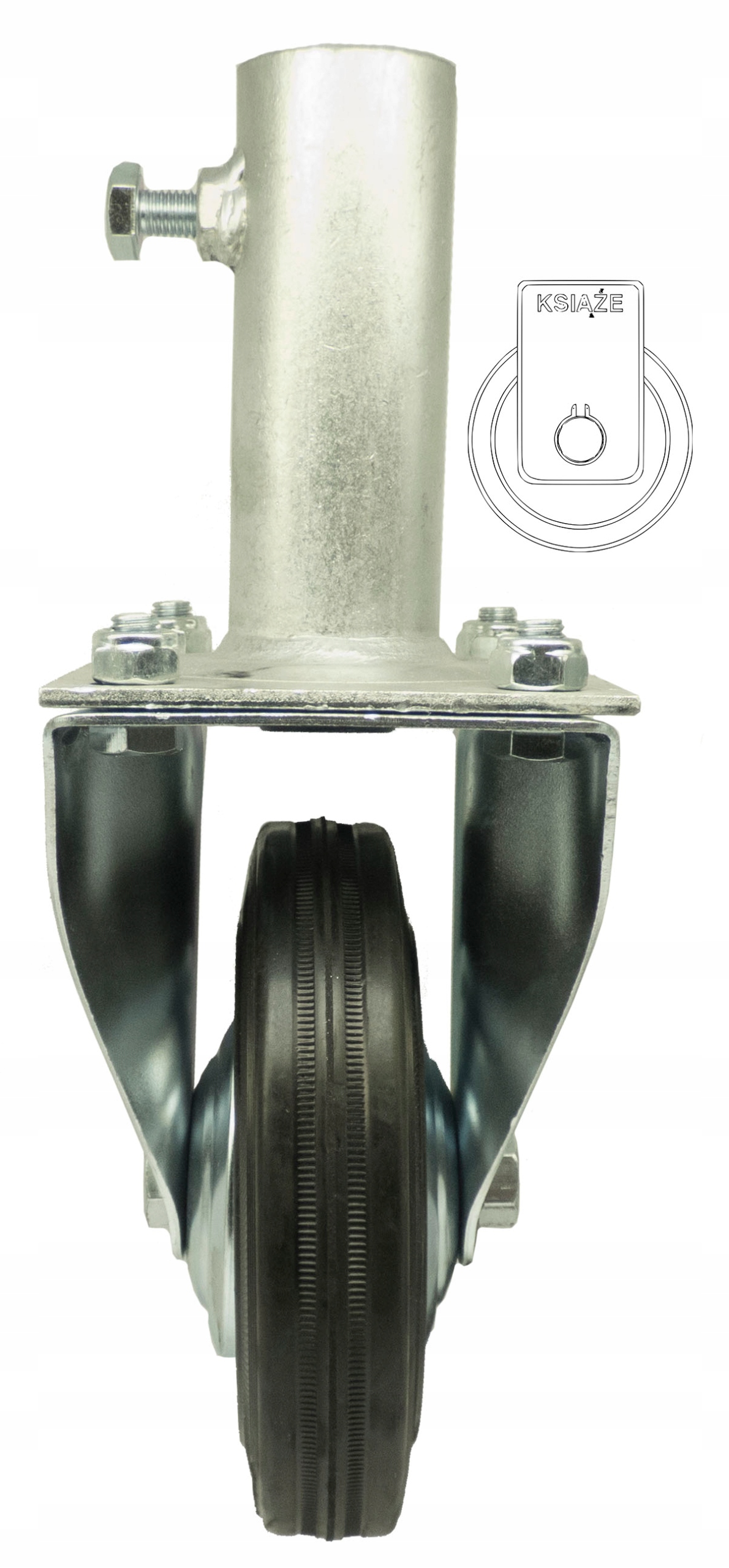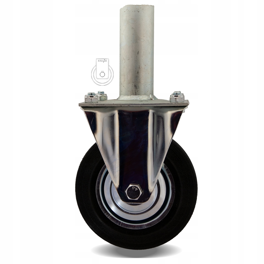 Koło posiada piastę metalową oraz oponę gumową, obudowa pokryta jest ocynkiem.