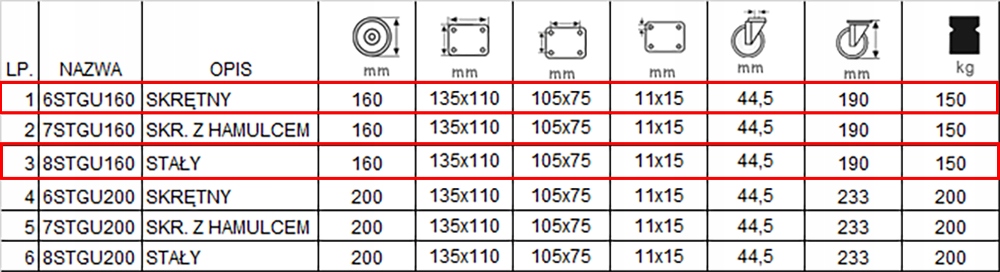 W skład kompletu wchodzą cztery koła mocowane na trzpień. Dwa koła są bez hamulca, o kodzie 6STGU160/40, w tabeli pod pozycją 1 oraz dwa koła stałe o kodzie 8STGU160/40, w tabeli pod pozycją 3.