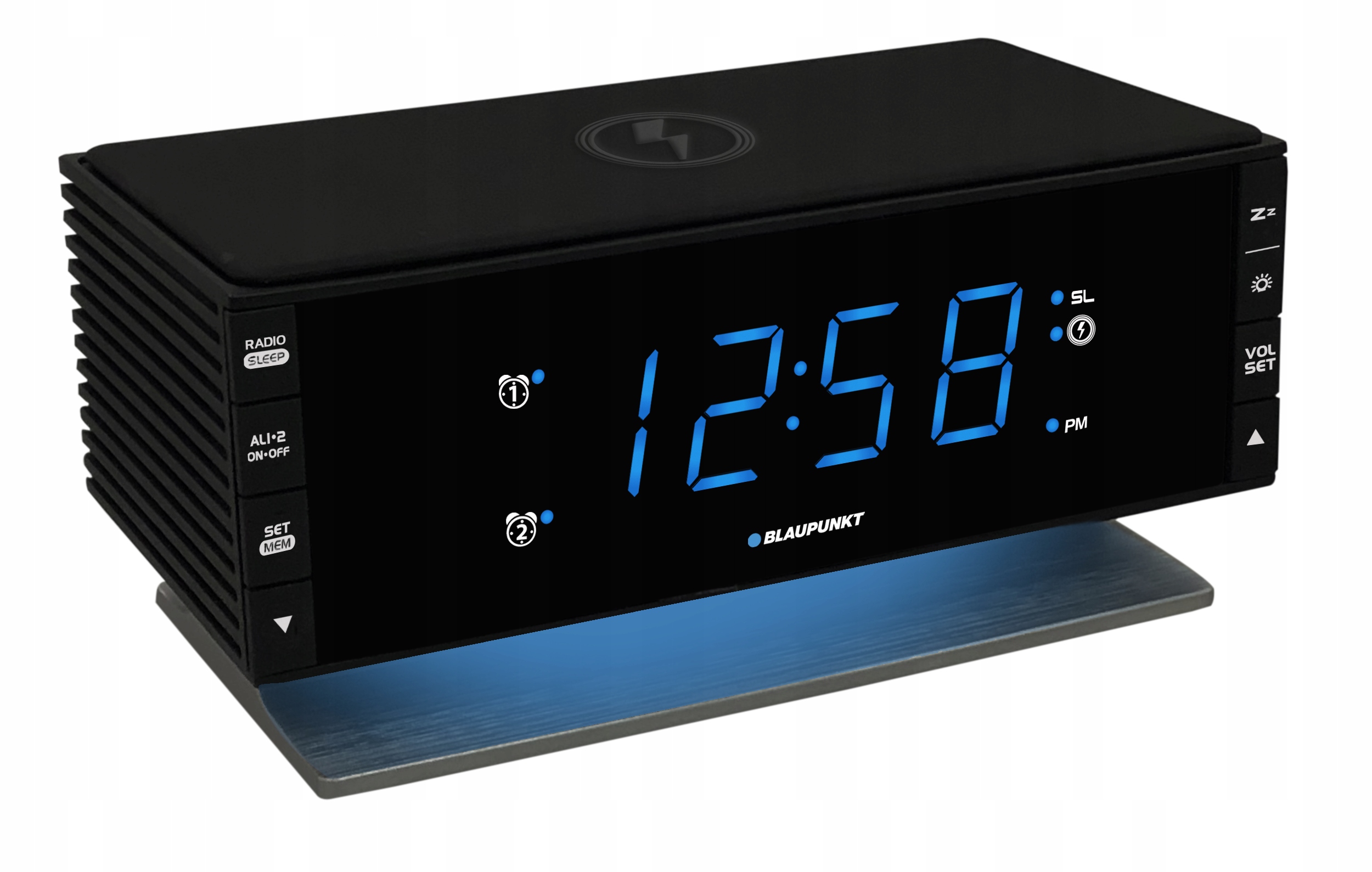 Drugi sposób, to ładowanie bezprzewodowe. Wystarczy położyć urządzenie przenośne tylną stroną, centralnie na górnym panelu radiobudzika oznaczonym punktem ładowania. Podświetlony wskaźnik ładowania bezprzewodowego na wyświetlaczu oznacza, że urządzenie mobilne jest właśnie ładowane.