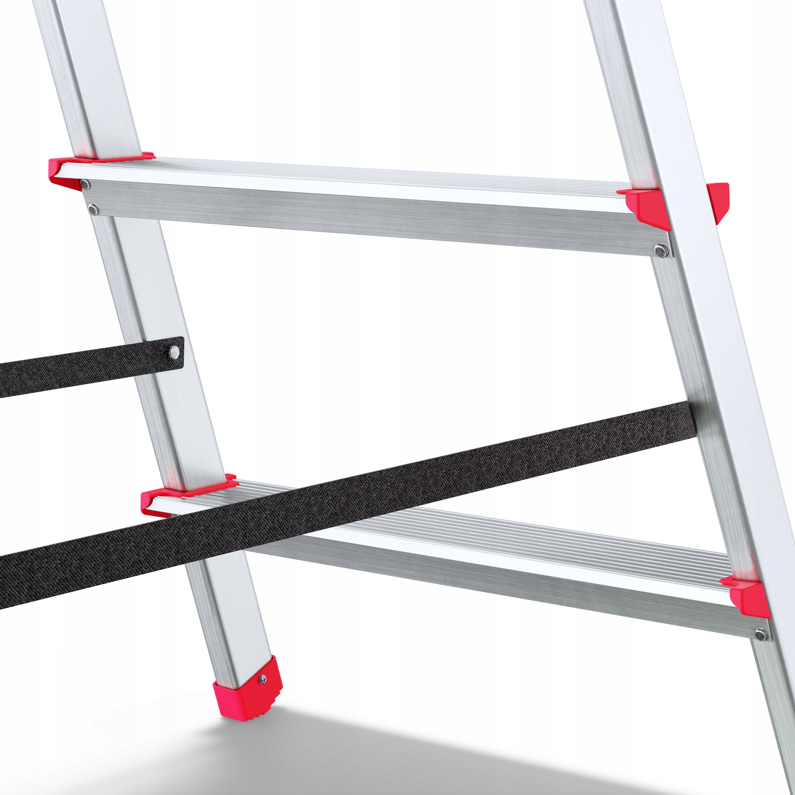 Czarne paski wykonane z polipropylenu nie tylko zapewniają odpowiedni rozstaw drabiny, ale także działają jako skuteczny ogranicznik, który zapobiega nadmiernemu rozstawieniu. Dzięki nim możesz pracować z większym poczuciem bezpieczeństwa, mając pewność, że drabina pozostaje stabilna w trakcie użytkowania.