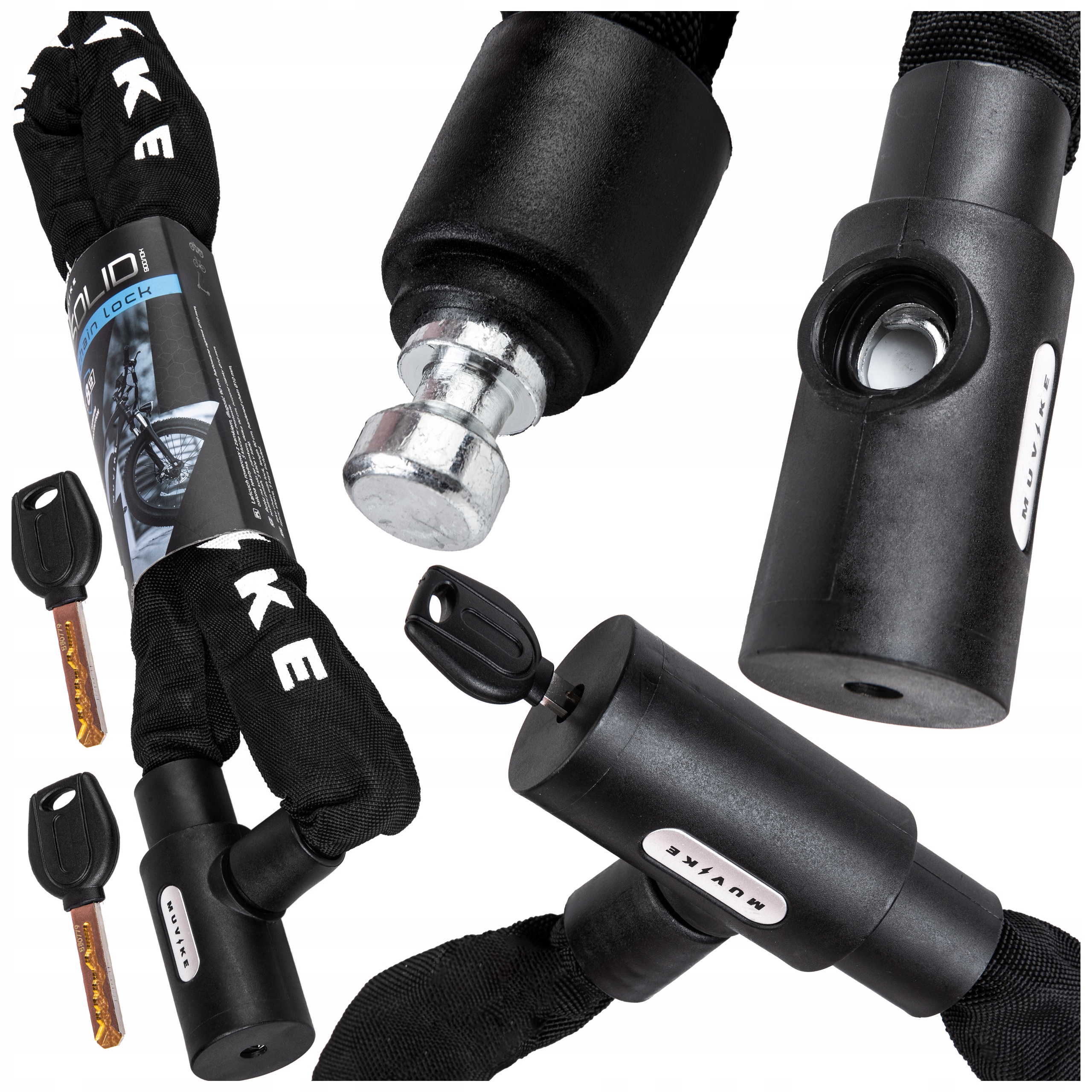 Zapięcie do roweru łańcuch Muvike Solid 900/10K to bardzo solidny łańcuch, który skutecznie chroni przed kradzieżą. Dzięki optymalnej długości łatwo przypniesz rower do różnych obiektów, a zamek na symetryczny klucz zapewnia szybkie i wygodne użycie.