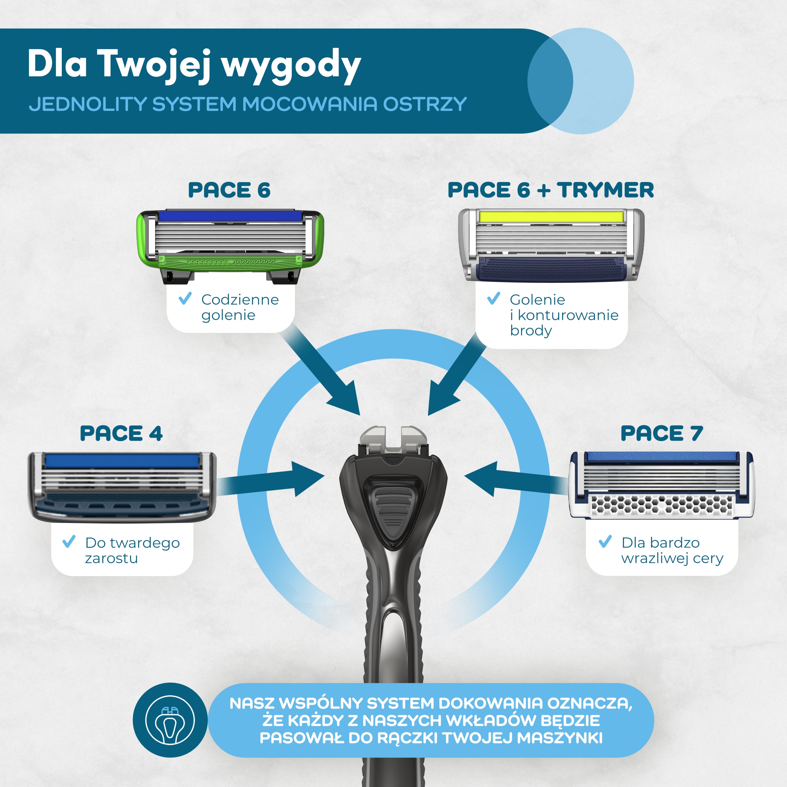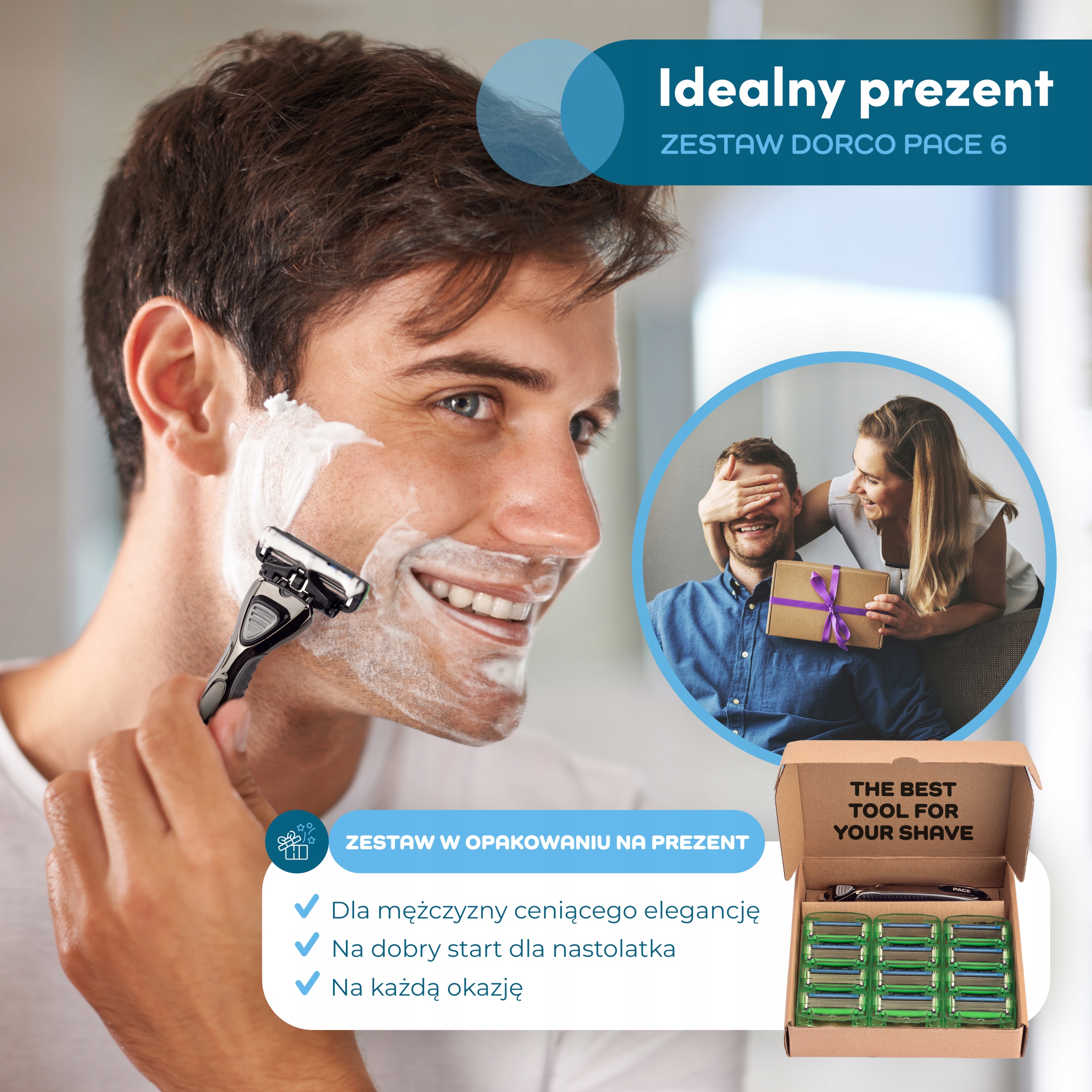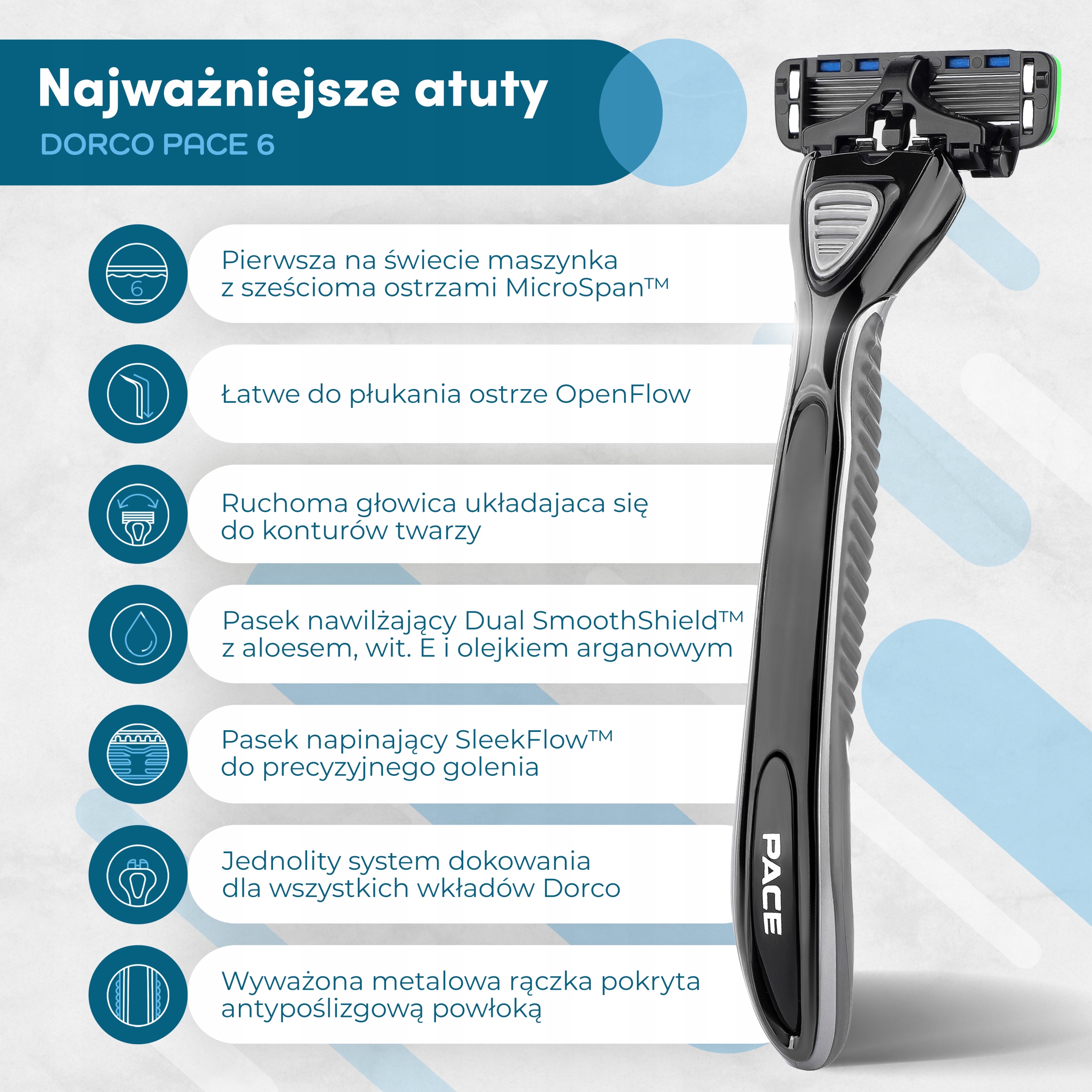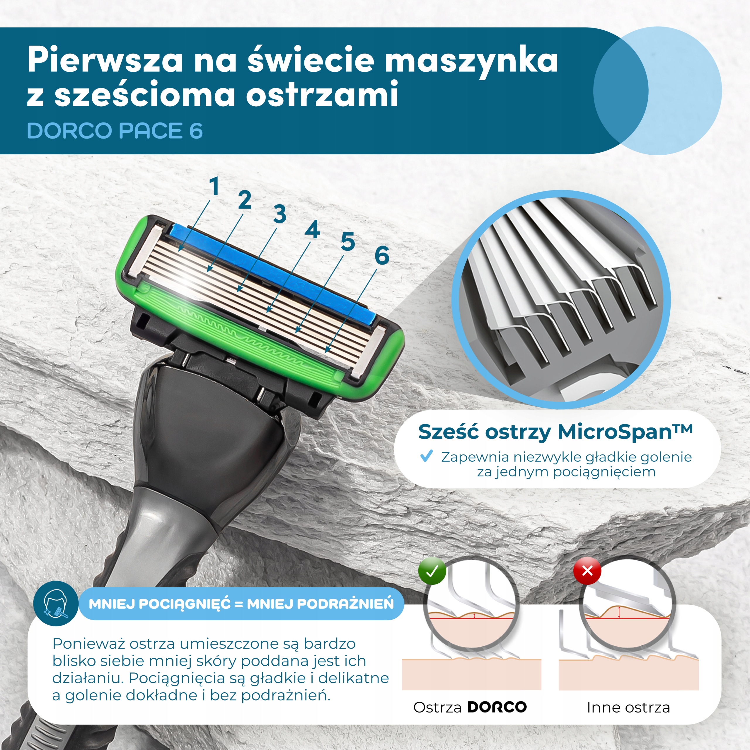 Dorco Pace6 to pierwsza na świecie maszynka do golenia z 6 ostrzami. Zapewnia codzienne komfortowe golenie bez podrażnień. Idealna dla twardego zarostu. Sześć ostrzy gładko przesuwa się po twojej skórze a pasek nawilżający pozostawia uczucie świeżości i ukojenia. Otwarta struktura ostrzy pozwala utrzymać je w czystości co zwiększa ich żywotność.