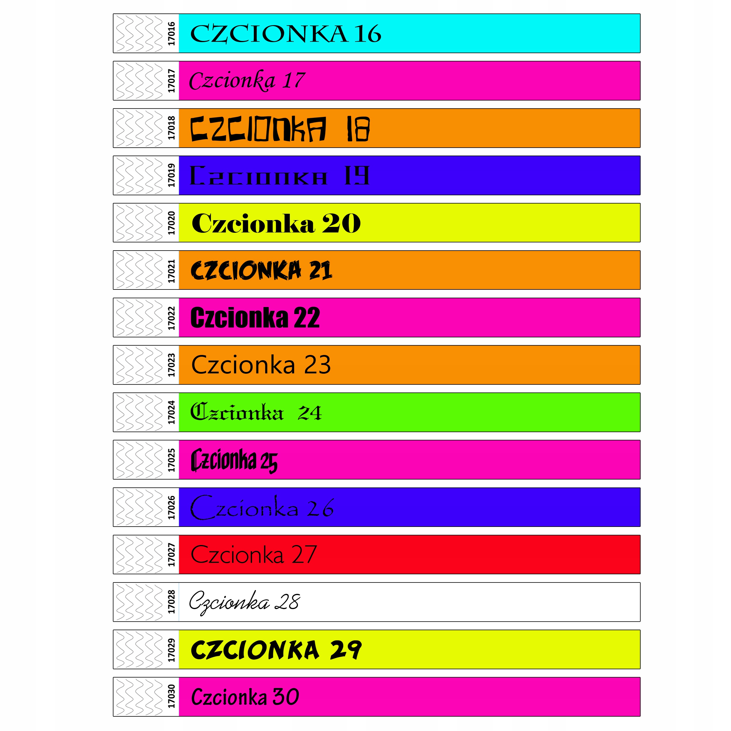 Z poniższych szablonów proszę wybrać czcionkę która Państwa interesuje. W wiadomości dla sprzedającego proszę napisać numer czcionki, kolor opasek oraz treść nadruku jaka ma być umieszczona na opaskach + ewentualne logo proszę przesłać na naszego maila.