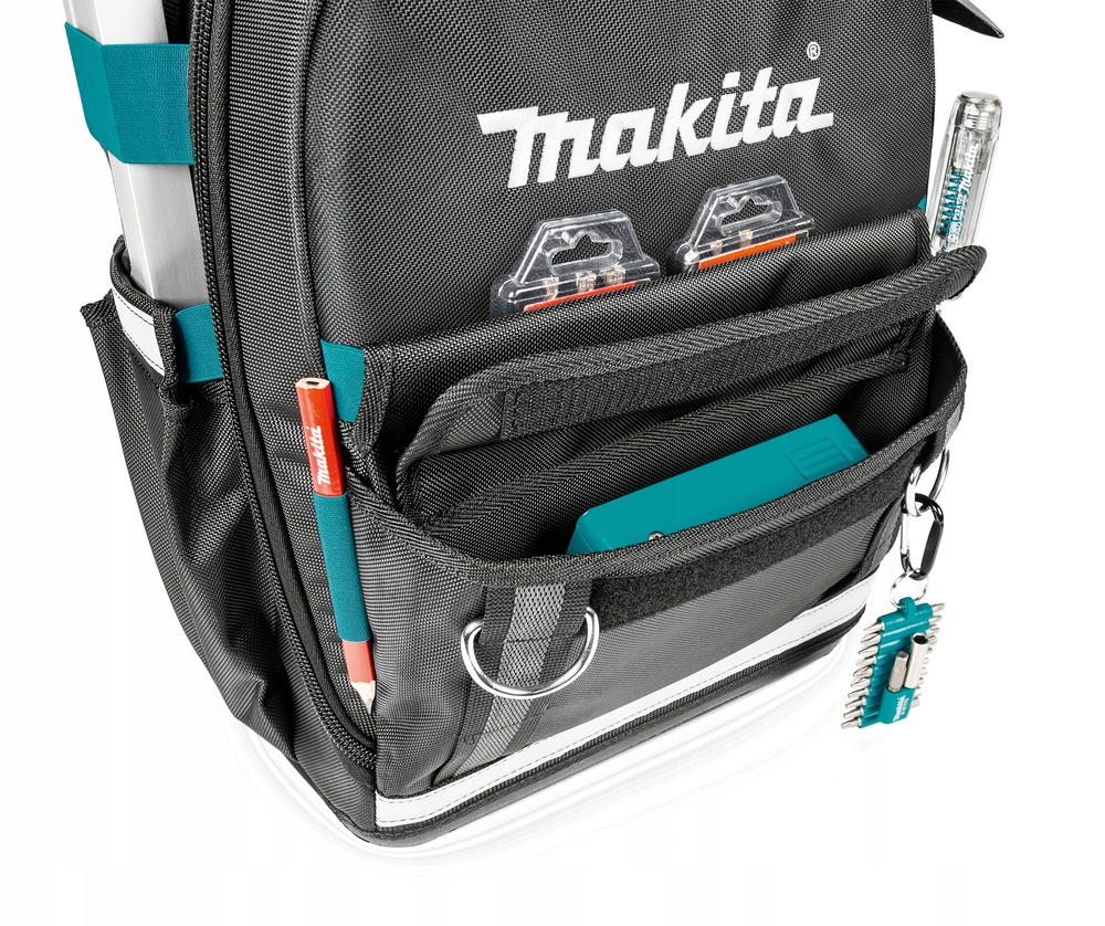 Plecak na narzędzia i akcesoria, z elastycznymi elementami zapewniającymi bezpieczny transport. Z bocznymi kieszeniami na np. butelkę z płynem lub poziomicę. Przednia kieszeń do przechowywania mniejszych przedmiotów. Pasy naramienne o regulowanej długości, które zapobiegają niewygodnemu naciskowi zawartości plecaka.