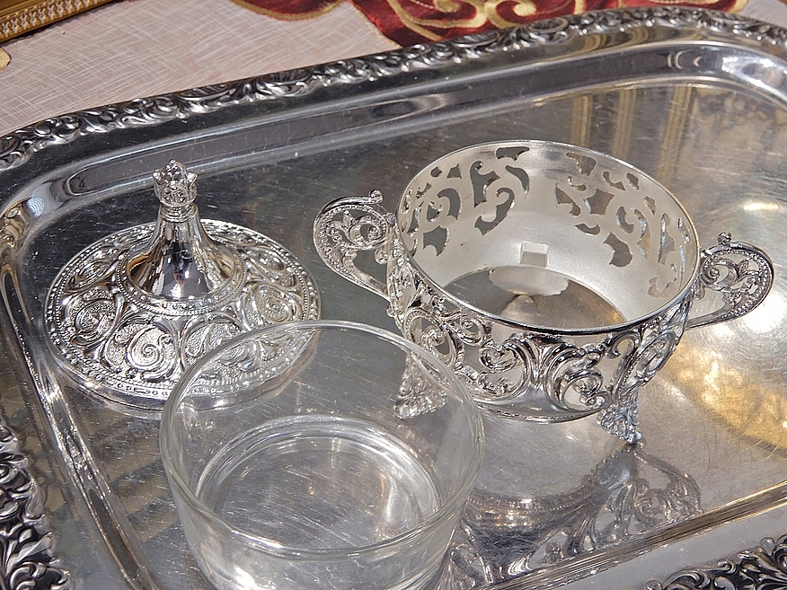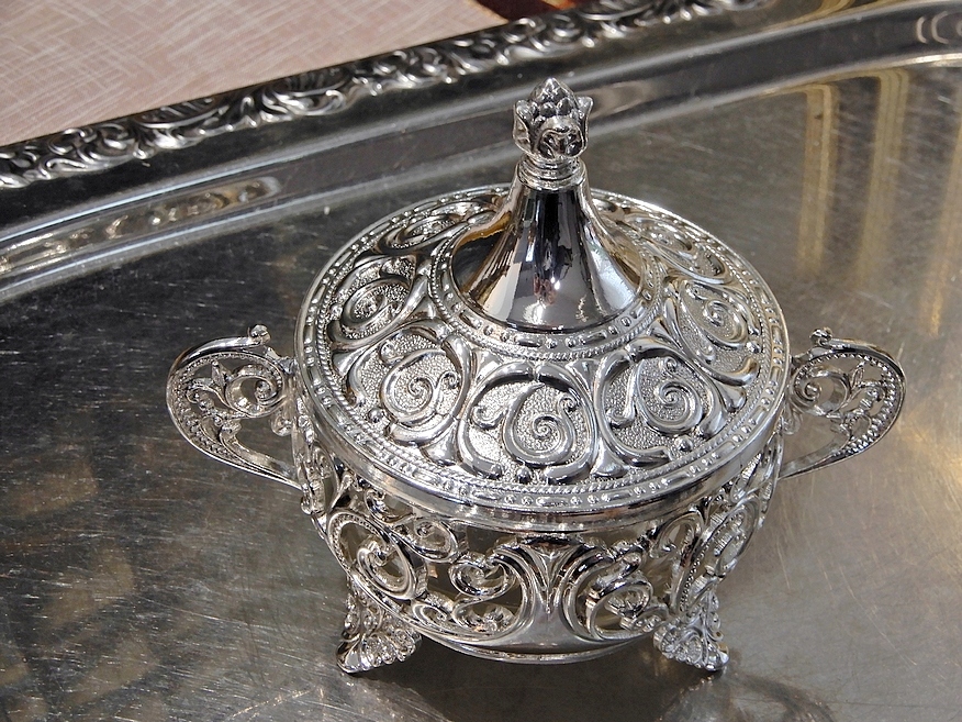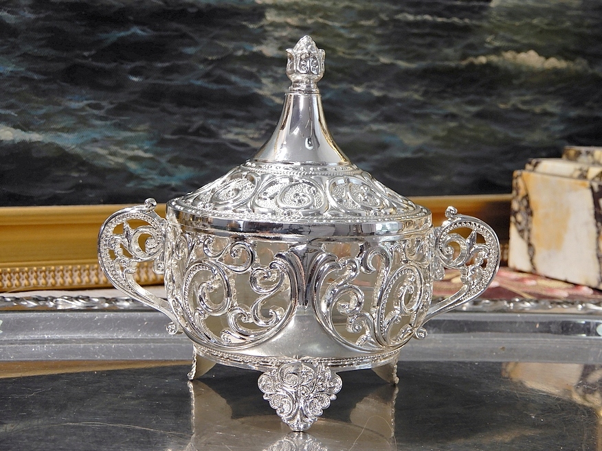 Odkryj elegancję i funkcjonalność w naszej posrebrzanej cukiernicy ze szklanym wkładem oraz subtelnie zdobionymi bokami, które emanują misternymi ażurowymi wzorami. To nie tylko cukiernica, ale także wszechstronny pojemnik, idealny na konfitury, miód czy kawior.