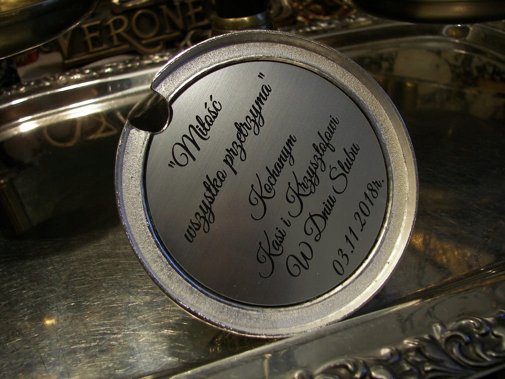 W pokrywę możemy wkleić okrągłą płytkę z laminatu grawerskiego z Twoją osobistą dedykacją. Płytka może być srebrna lub złota. To znacznie podnosi atrakcyjność przedmiotu. Wystarczy, że podasz nam tekst, wybierzesz czcionkę i zapłacisz za towar i usługę. :)