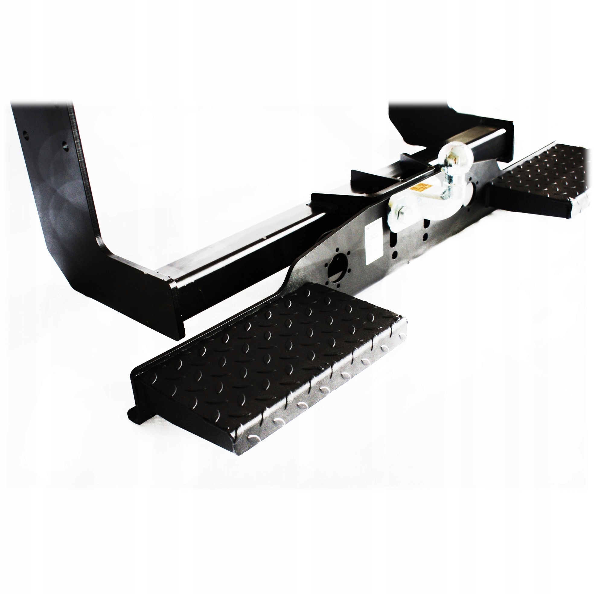 Stabilny stopień dwustronny ułatwia załadunek towaru przez tylne drzwi samochodu. Dostępny tylko z poprzeczką do mocowania haka.