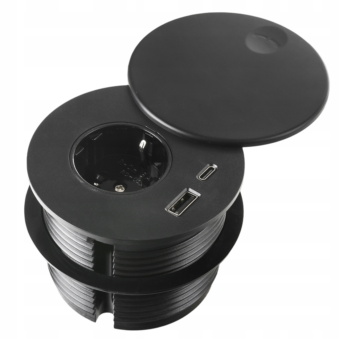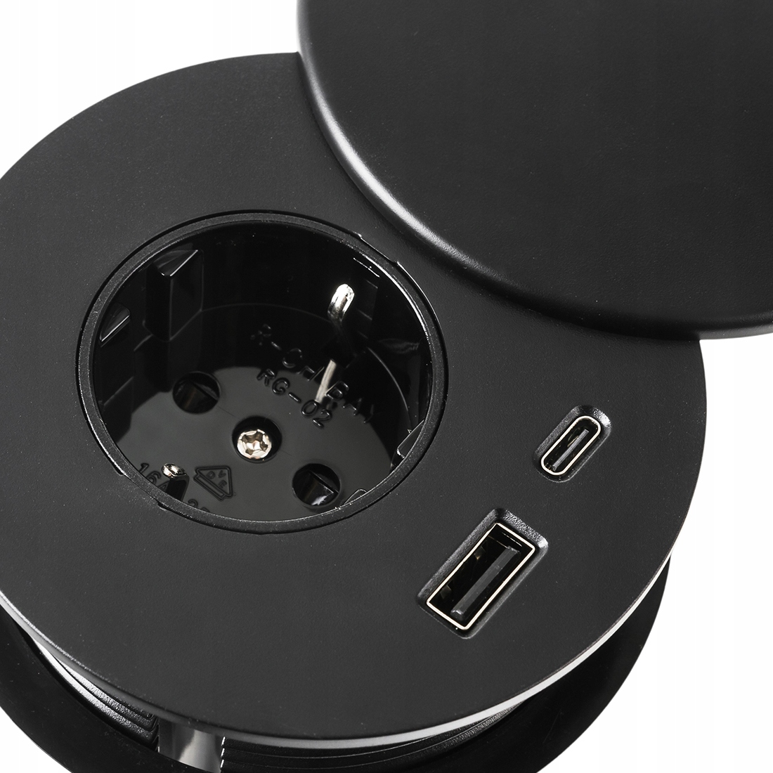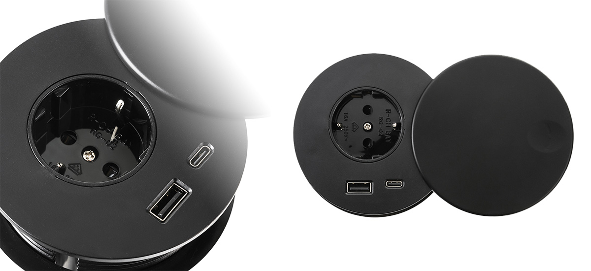 Mediaport Spacetronik ERGOLINE SPS-R1D3B to nowoczesne rozwiązanie, które znajduje zastosowanie w sklepach, salonach sprzedaży, salach konferencyjnych, biurach a także w domu. Wykonany z wysokiej jakości komponentów. Produkt jest przeznaczony do montażu wewnątrz pomieszczeń w biurkach, blatach i stołach, zarówno w pozycji pionowej jak i poziomej, zapewniając dostęp do gniazd. Ten okrągły mediaport został wyposażony w 1 gniazdo 110-250 V (typ german) oraz podwójną ładowarkę USB składającą się z USB-A oraz USB-C.