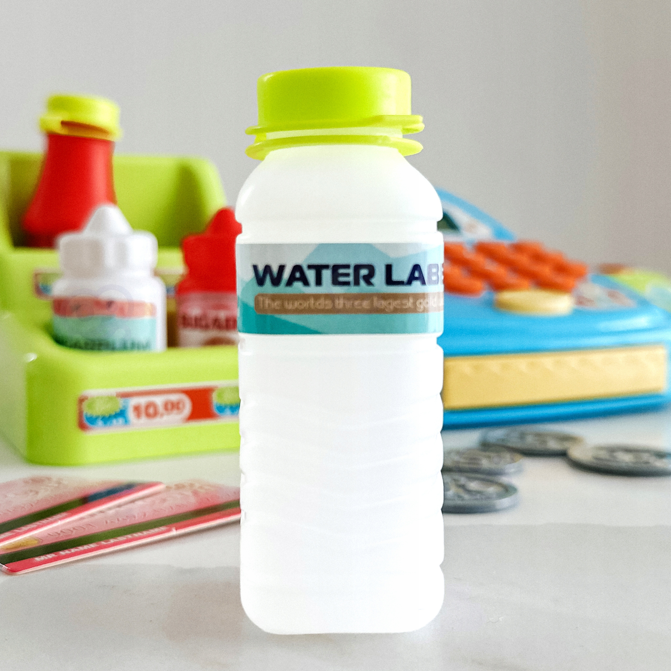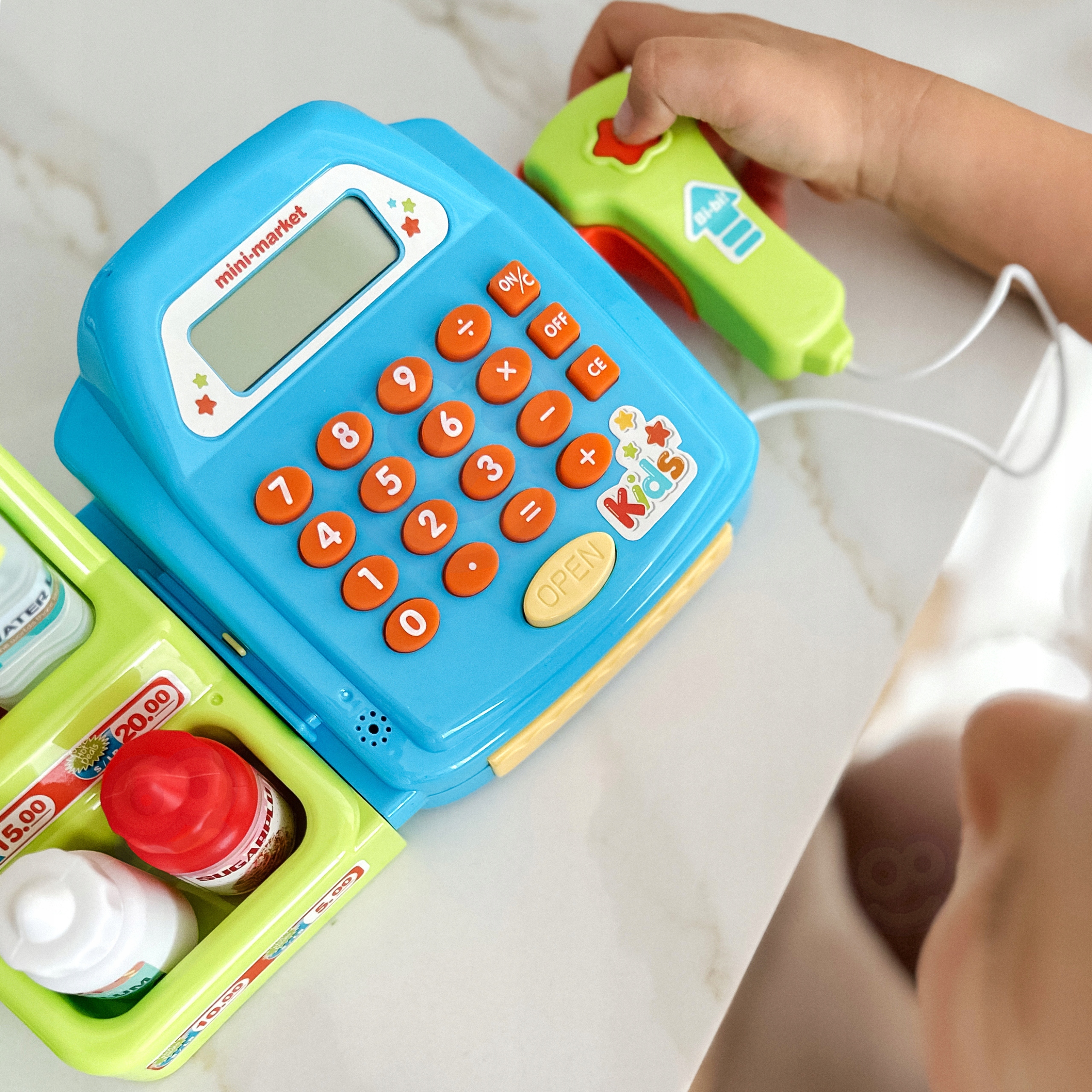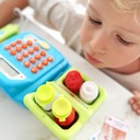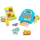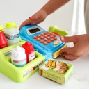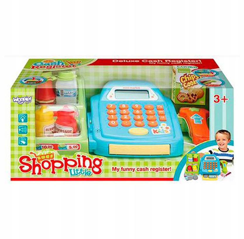 Касса магазина с полкой от бренда WOOPIE это идеальное игровое предложение. Дети могут выбрать продукты, которые они хотят купить, они едят на деньги. С помощью считывателя они будут сканировать печенье и другие продукты. Тогда покупатель может оплата наличными или платежной картой.