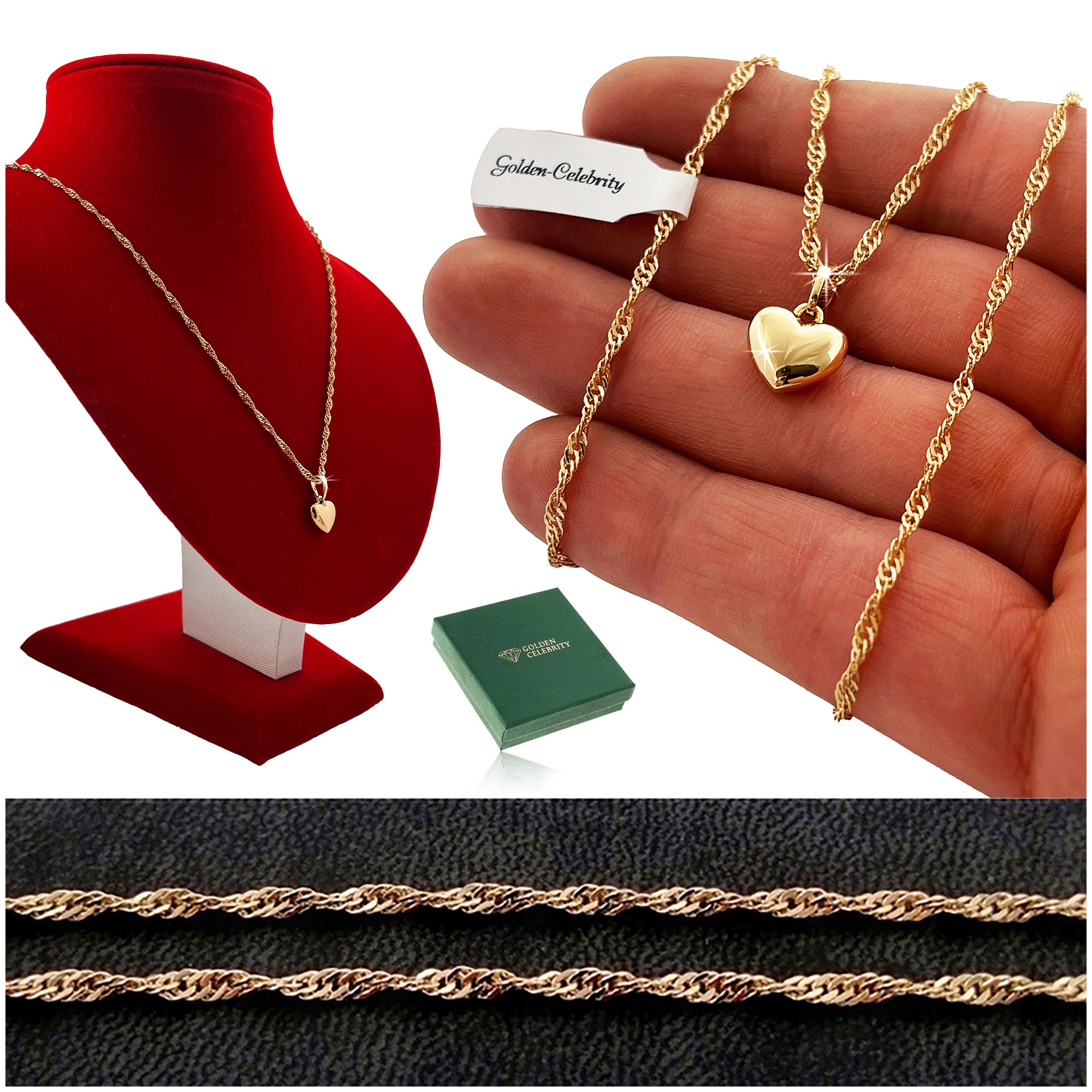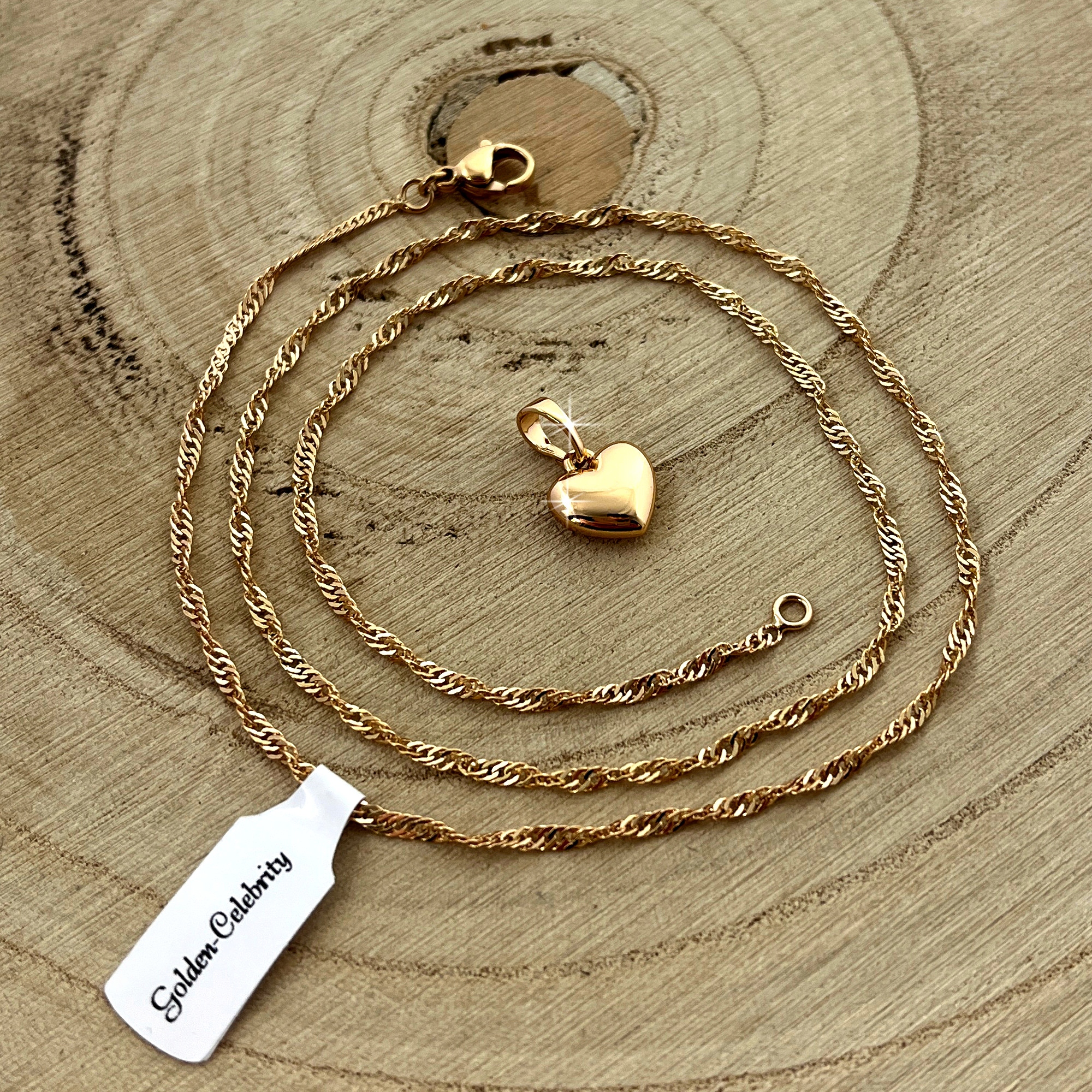 Przedstawiamy państwu zjawiskowy damski naszyjnik na łańcuszku singapur wraz z pięknym, klasycznym sercem. Produkt został wykonany z najwyższej jakości stali chirurgicznej. Całość została pokryta prawdziwym 18 karatowym złotem. Ten model naszyjnika z pewnością doceni każda kobieta. Łańcuszek jest solidny i wtrzymały więc spokojnie posłuży długi czas.