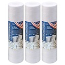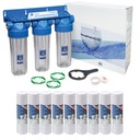 Trójstopniowy zestaw narurowy marki AQUAFILTER z zestawem wkładów mechanicznych. System redukuje poziom zanieczyszczeń mechanicznych: piasek, rdza, zawiesiny, nie mniejszych niż 5 mikronów.