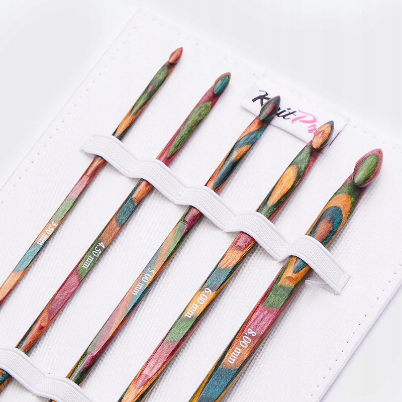 W skład zestawu wchodzi 5 szt. szydełek w rozmiarach: 3,5 mm; 4,5 mm; 5,0 mm; 6,0 mm; 8,0 mm. Wszystko zapakowane jest w zgrabne etui o odcieniach fioletu.
