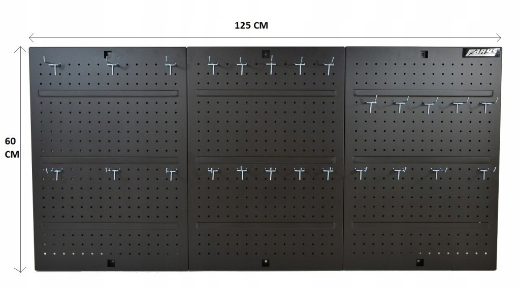 Wykonana z wysokiej jakości blachy. W zestawie znajduje się 25 haczyków, tablica składa się z trzech elementów o wymiarach 41,5 cm x 60 cm.