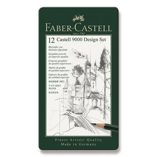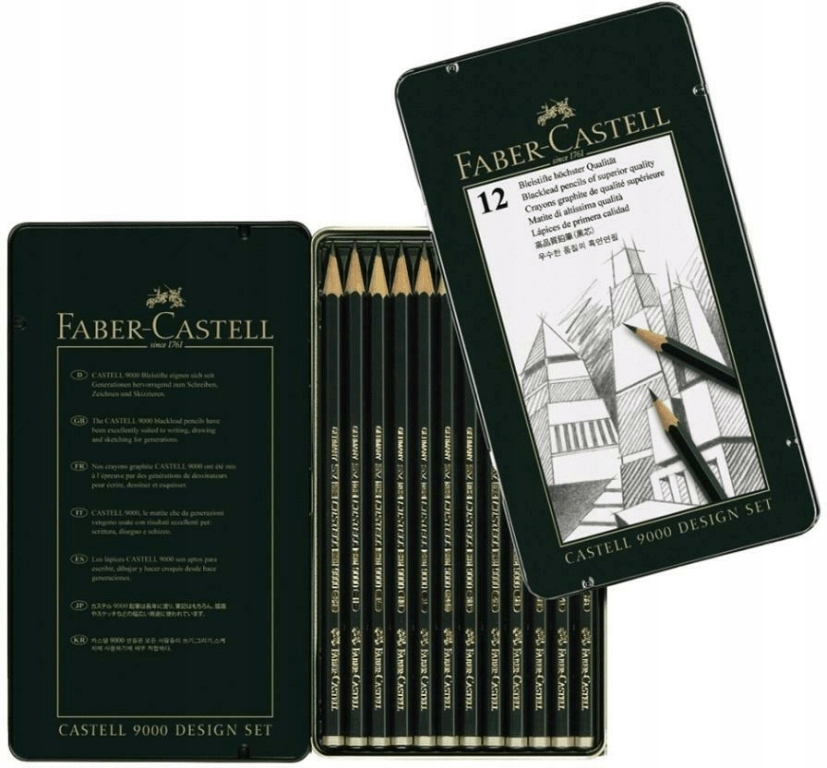 Zestaw ołówków grafitowych Castell 9000 Faber-Castell Design 12 szt. w kolorze zielonym w opakowaniu metalowym. Kultowe i klasyczne – sześciokątne ołówki najwyższej jakości z wieloletnią tradycją. Wprowadzone na rynek przez hrabiego Alexandra von Faber-Castell w 1905 roku. Ich jakość i precyzyjnie stopniowane stopnie twardości sprawiły, że stały się ulubieńcem artystów i ilustratorów. Odpowiednie nie tylko do pisania, ale też szkicowania i rysowania. Z odpornym na pękanie grafitem o stopniu twardości 2B, 3B, 4B, B, HB, F, H, 2H, 3H, 4H, 5H i 6H, dzięki bezpiecznemu procesowi wiązania (SV). Wykonane z certyfikowanego, miękkiego drewna pochodzącego ze zrównoważonego i odpowiedzialnie zarządzanego leśnictwa. Powierzchnie pokryte lakierem na bazie wody – bezpiecznym dla środowiska i zdrowia. Produkcja neutralna pod względem emisji dwutlenku węgla. Dostępne w 16 różnych stopniach twardości, co czyni je idealnym ołówkiem do wszystkich zastosowań technicznych i artystycznych. Każdy ołówek jest opatrzony kodem kreskowym.