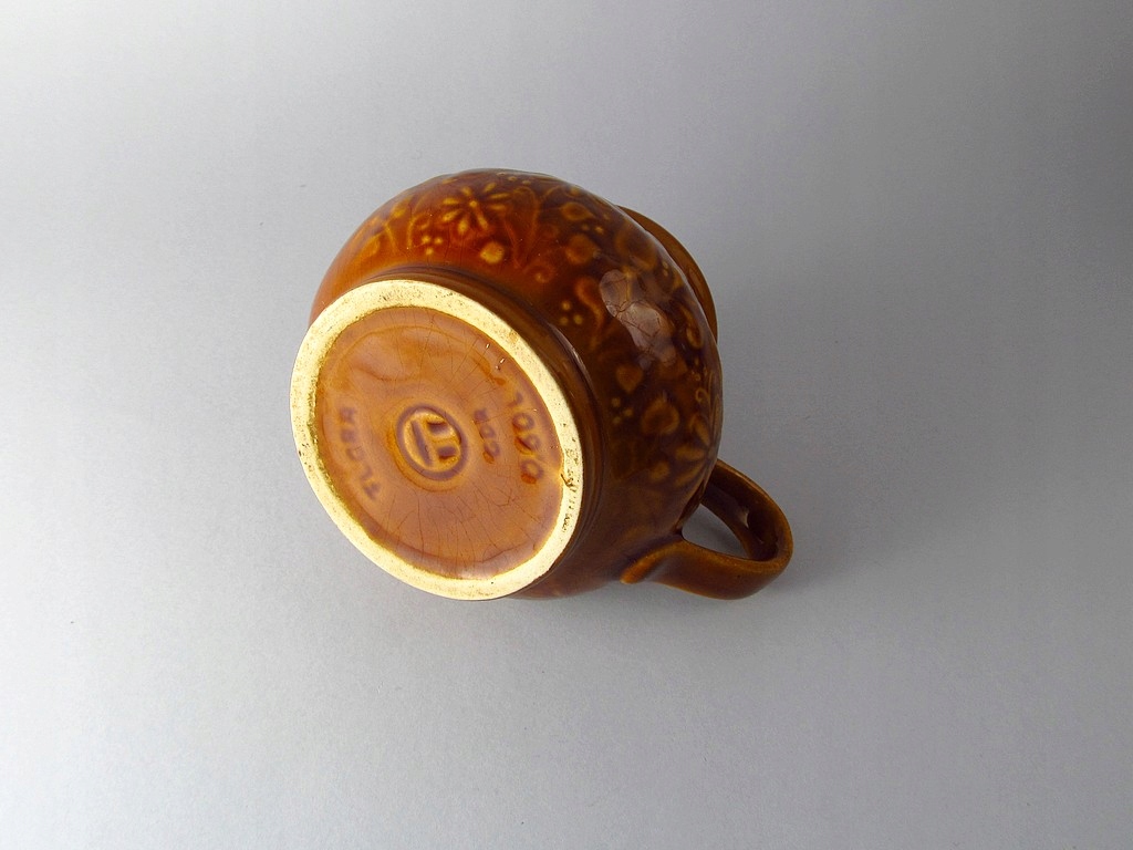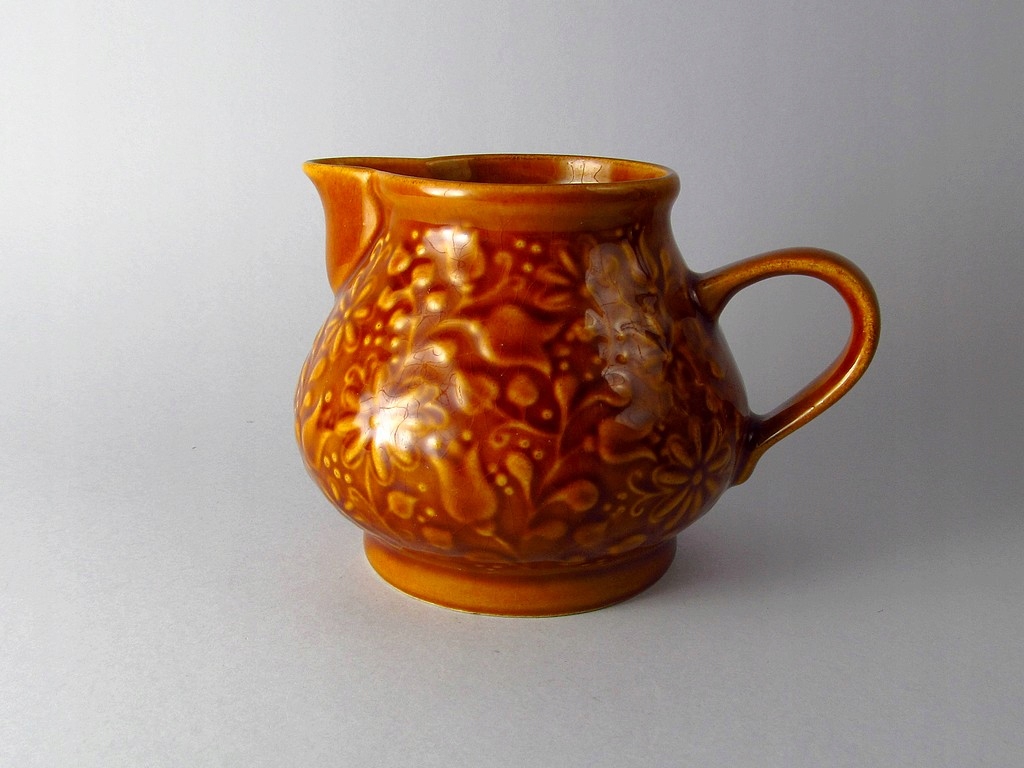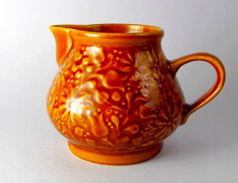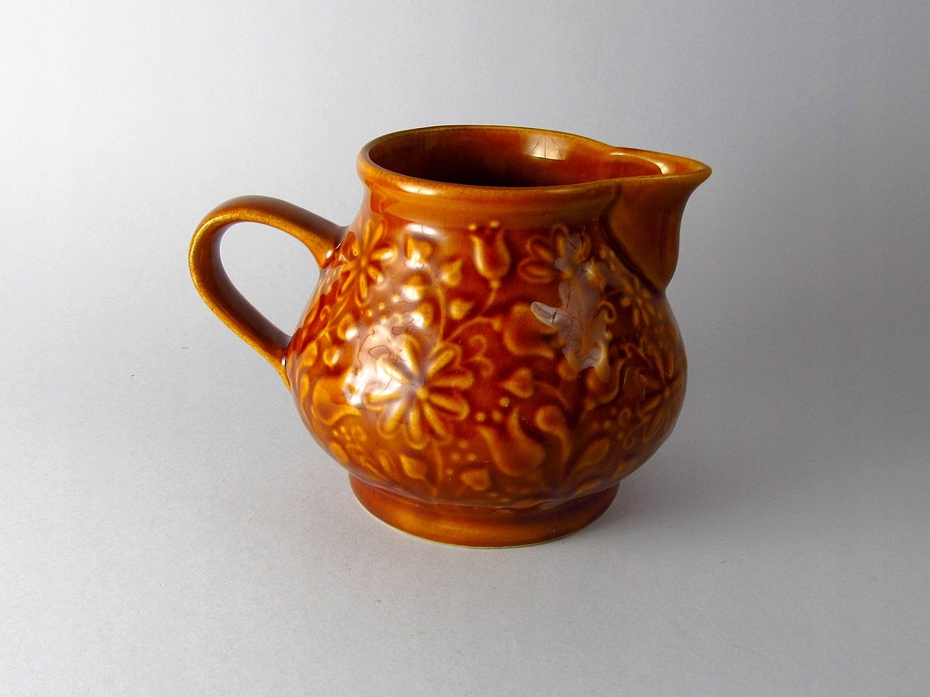 Witam Państwa serdecznie....... przedmiotem sprzedaży jest ręcznie wykonany ceramiczny dzban ..... Niemcy / lata 60-te XX wieku.......... proszę zwrócić uwagę na piękną, bogatą, kwiatową fakturę ............10,5 cm wysokości i 12 cm średnicy, świetny stan zachowania - dzban ma szkliwienie o silnym połysku, przez co na zdjęciu widać liczne refleksy - nie są absolutnie uszkodzenia, ani wady - dzban jest zachowany w idealnym stanie i na żywo prezentuje się duzo lepiej.......... piękna, stara ceramika i ozdoba Państwa domu! ..........GORĄCO POLECAM!!!!