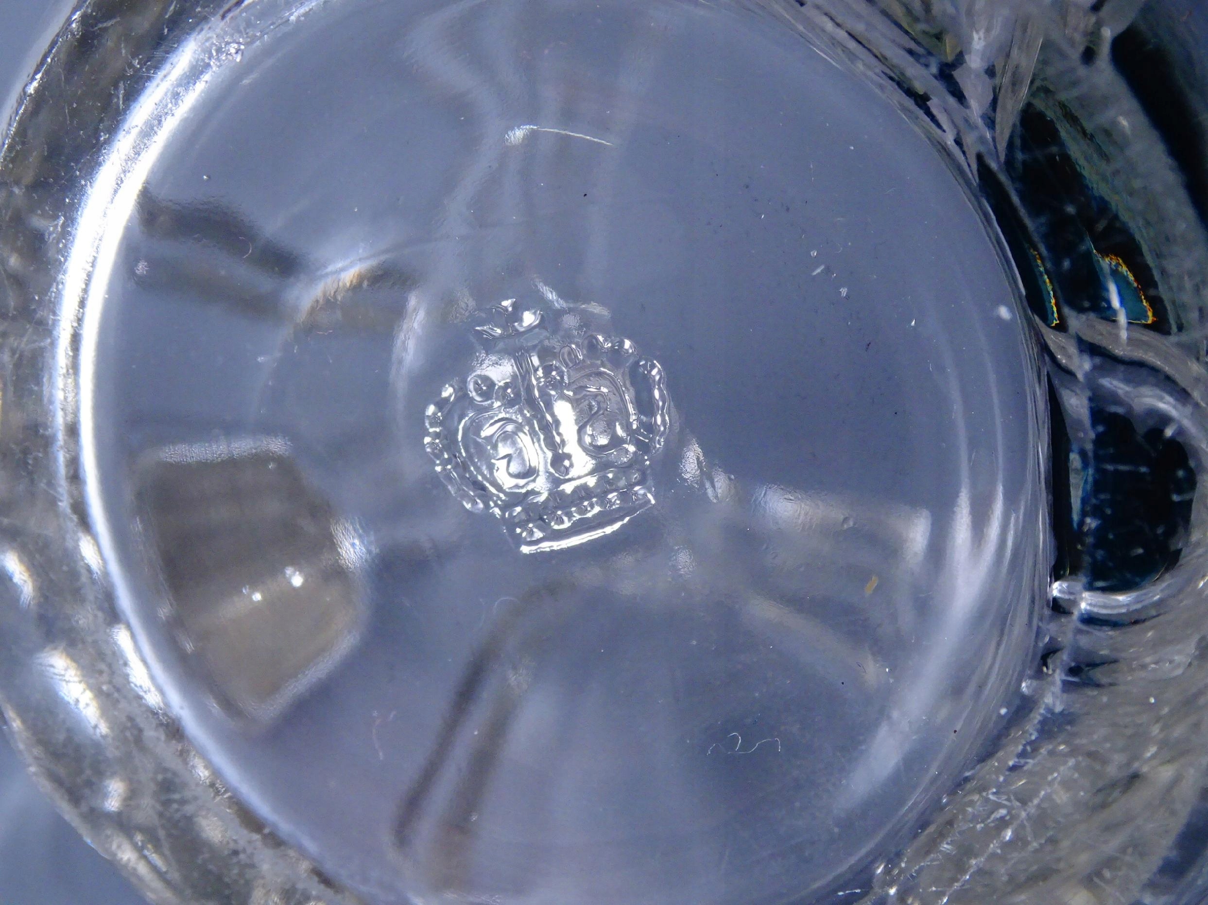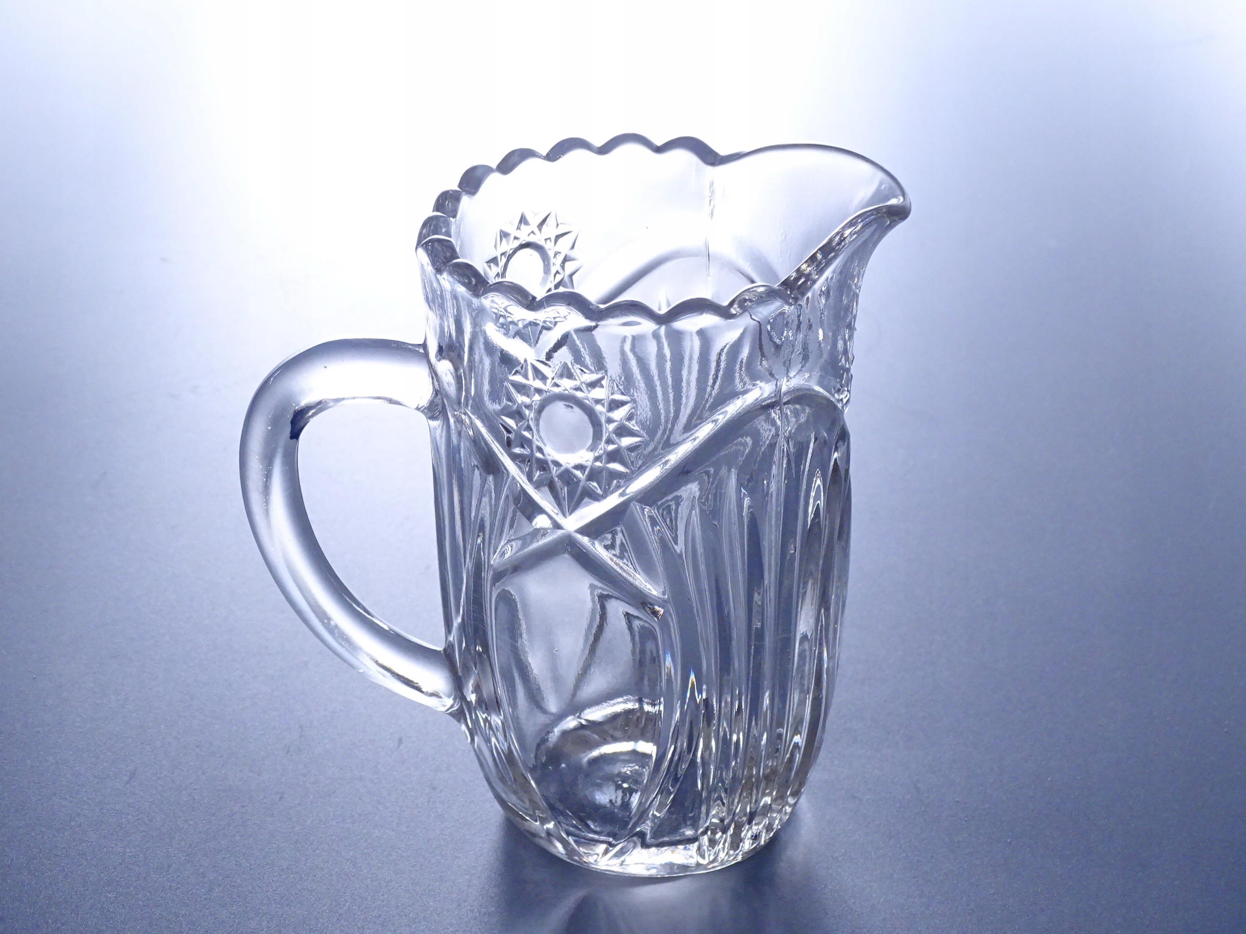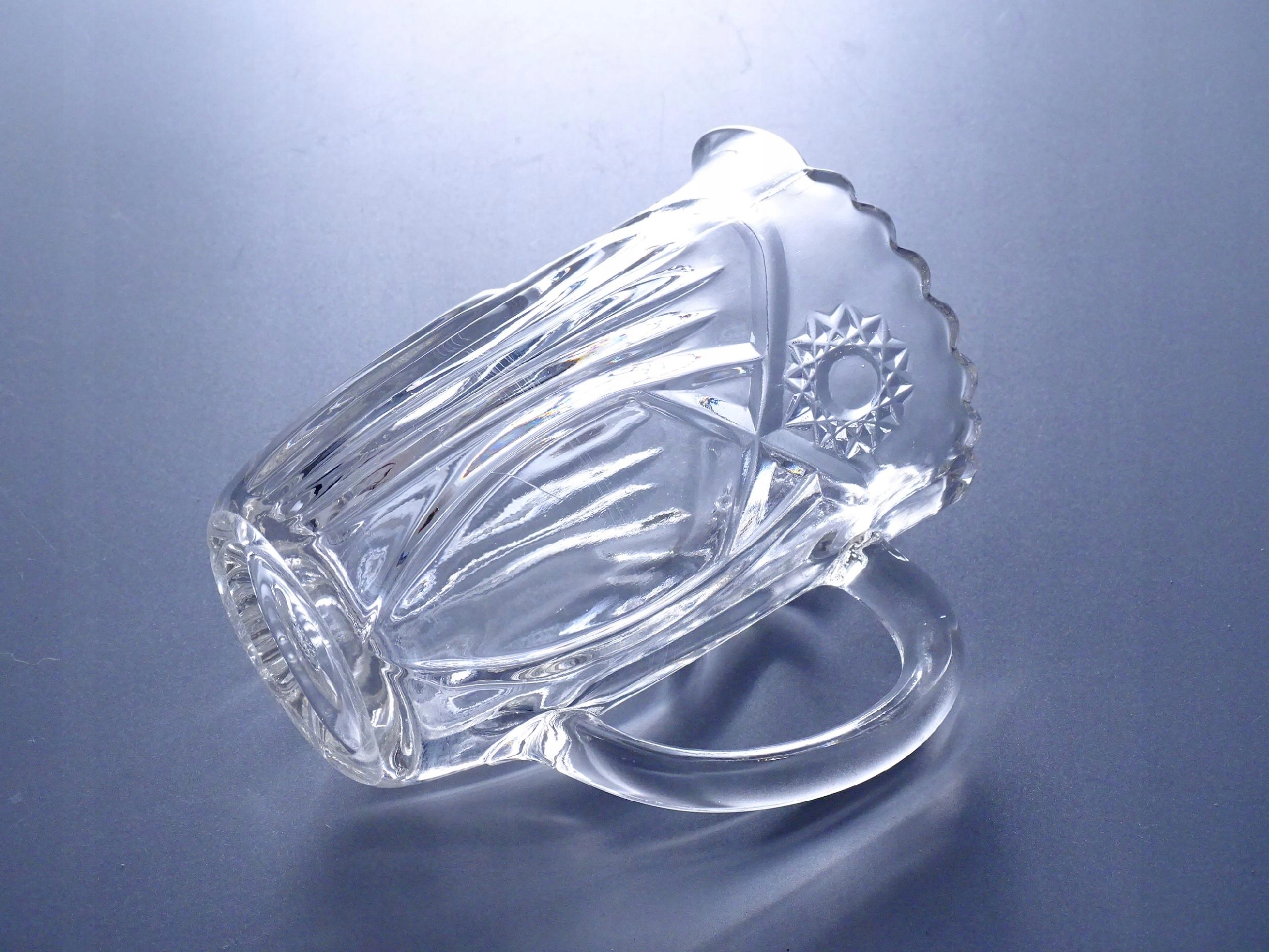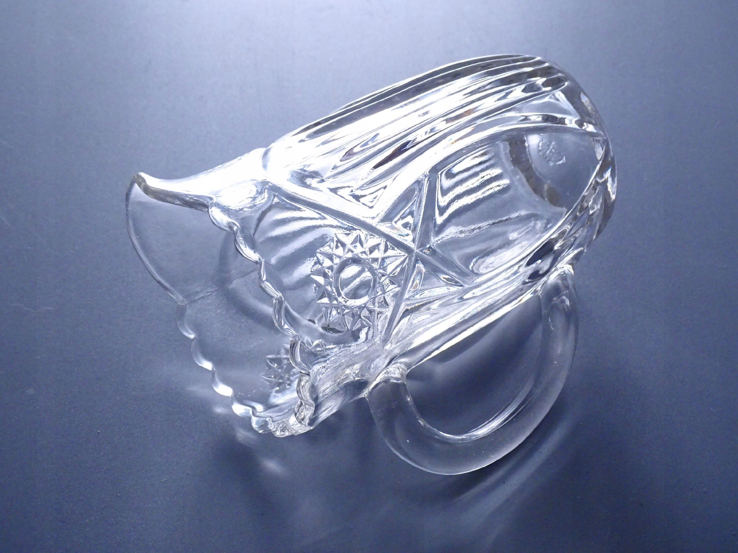 Oryginalny, zabytkowy dzbanek z prasowanego szkła.