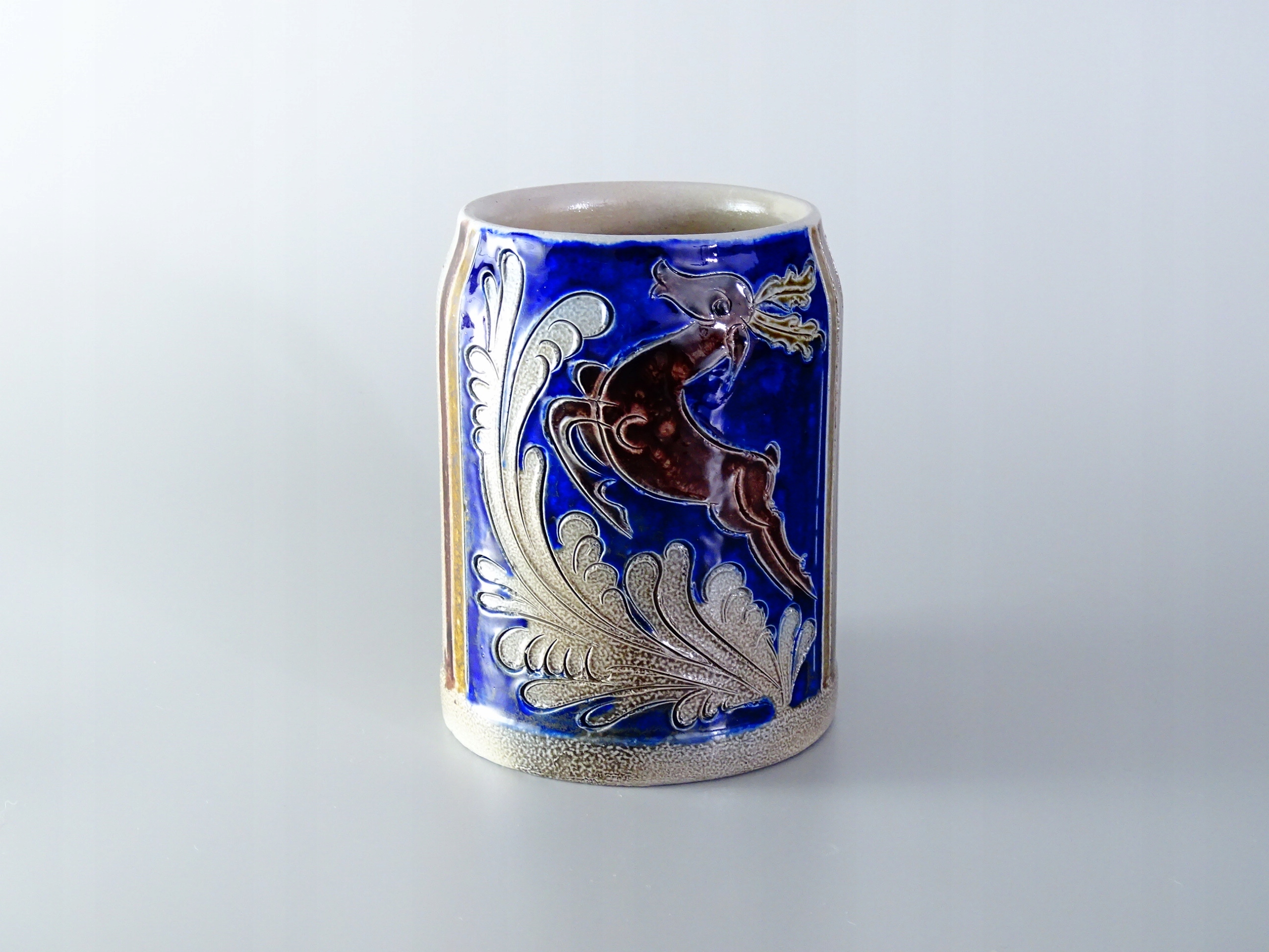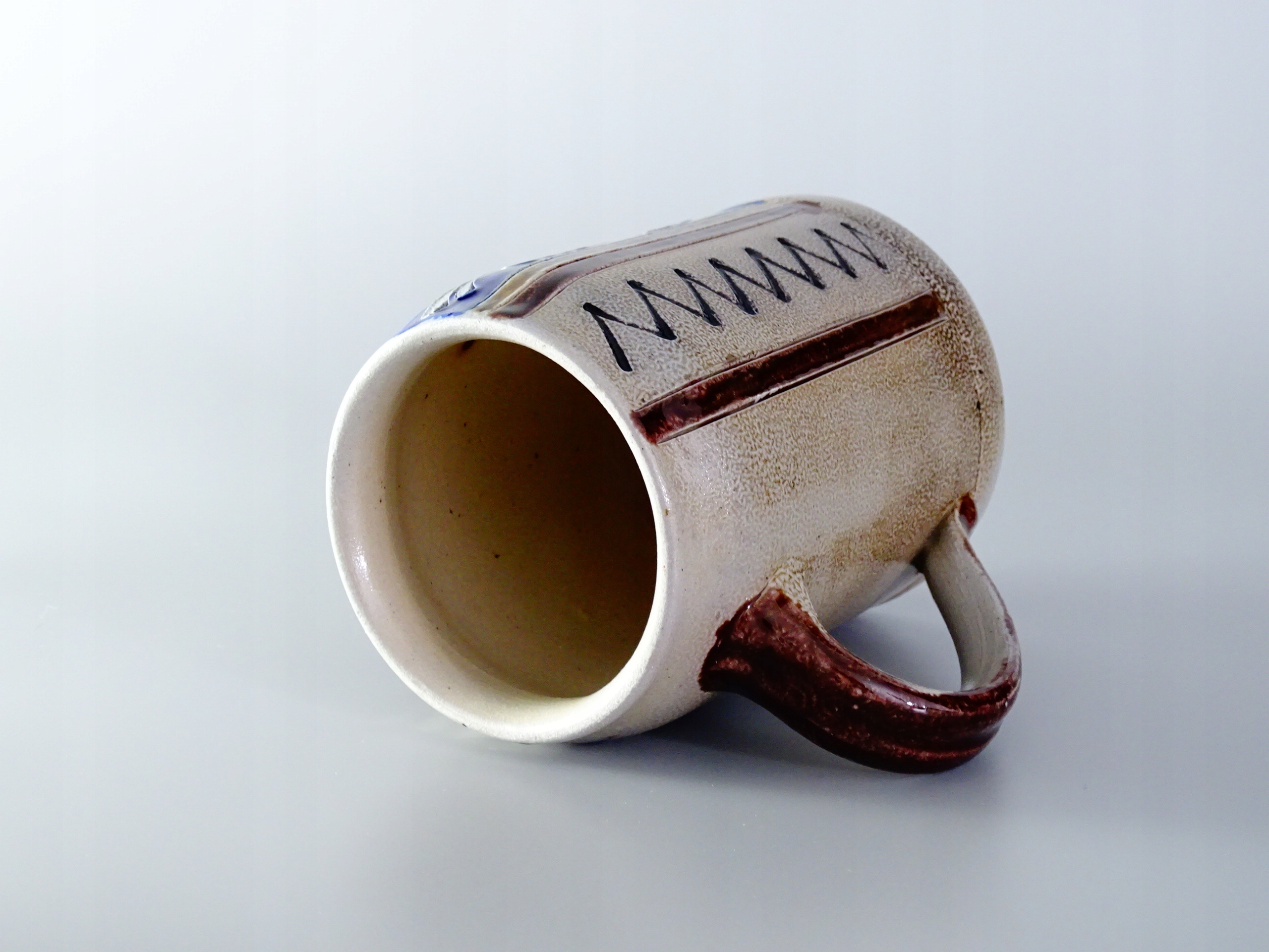 Piękny, stary kufel ze szkliwionej kamionki.