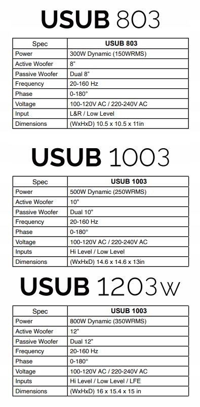 Każdy subwoofer z serii USUB wyposażony jest w jedną membranę aktywną i dwa pasywne radiatory, co gwarantuje potężne basy. Solidna obudowa zamknięta wykonana jest z grubej mieszanki drewna z wewnętrznymi wzmocnieniami. Górny panel subwoofera ozdabia eleganckie szczotkowane czarne aluminium.