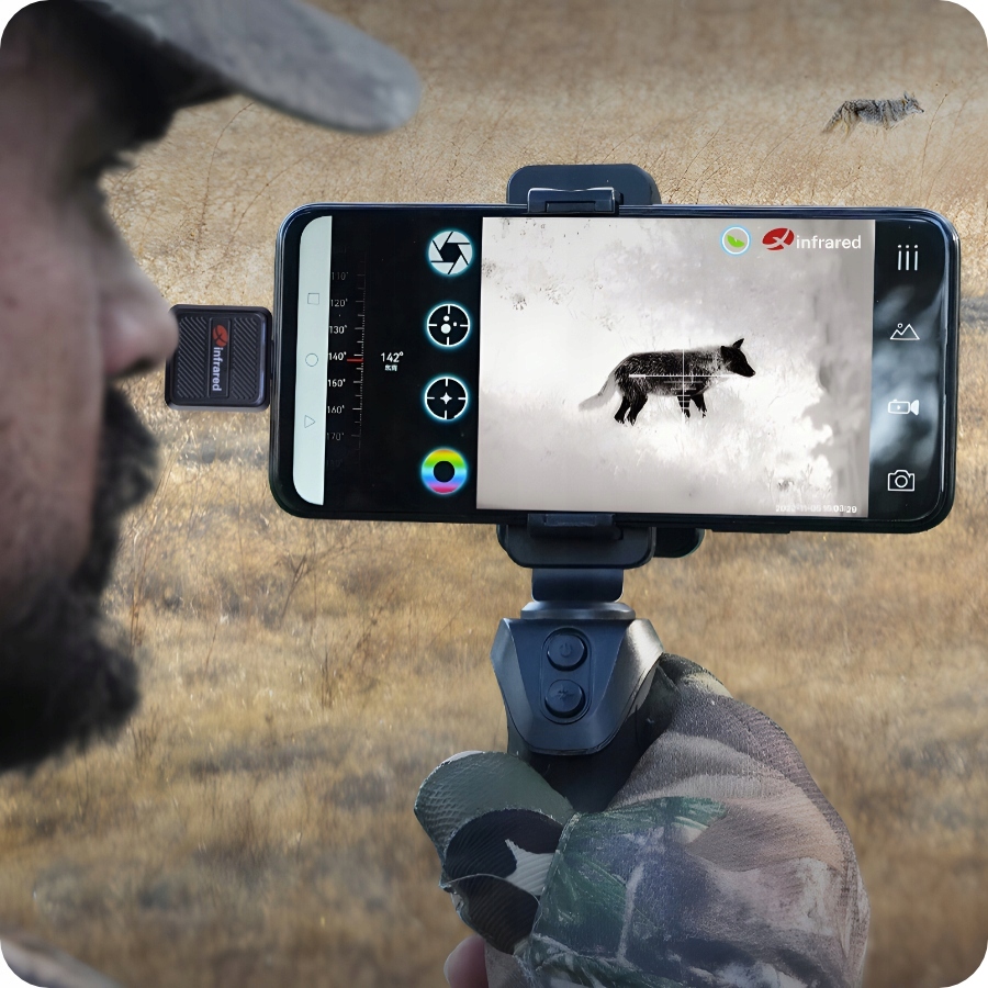 Do kamery dołączony jest specjalny uchwyt umożliwiający zamontowanie w nim telefonu, kamery termowizyjnej oraz celownika laserowego - co pozwoli na wygodnie i precyzjne pomiary.