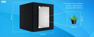 Namiot został wyposażony w dwa panele LED, których pozycję można regulować w celu osiągnięcia różnych setupów oświetleniowych. Jego wnętrze zostało pokryte specjalnym materiałem, który równomiernie rozprowadza generowane przez lampy światło. Dodatkowy dyfuzor pozwala uzyskać efekt rozproszonego, miękkiego oświetlenia, redukując przy tym powstawanie odblasków, odbić oraz cieni na fotografowanym produkcie.