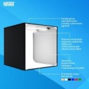 W zestawie znajduje się sześć kolorów tła (białe, czarne, pomarańczowe, czerwone, niebieskie oraz zielone). Pozwalają na kreatywną aranżację całej kompozycji w zależności od specyfiki fotografowanego produktu. Namiot bezcieniowy Newell M40II posiada dwa